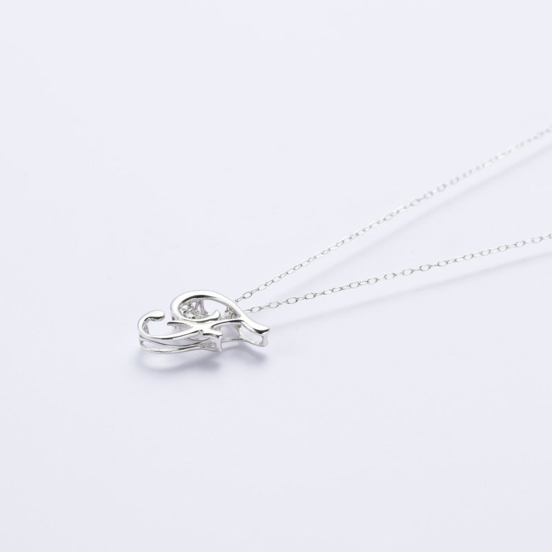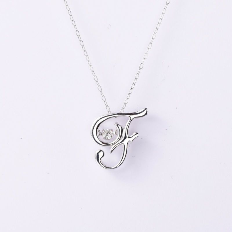 イニシャル「F」のモチーフの中にダイヤモンドを留めたダンシングストーンネックレスです。お名前は、ご両親から頂く最初のプレゼントです。イニシャルモチーフは、一生モノのジュエリーとしてお召し頂けます。