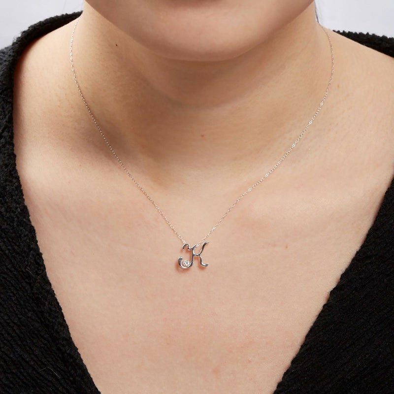 イニシャル「K」のモチーフの中にダイヤモンドを留めたダンシングストーンネックレスです。お名前はご両親から頂く最初のプレゼントです。イニシャルモチーフは一生モノのジュエリーとしてお召し頂けます。