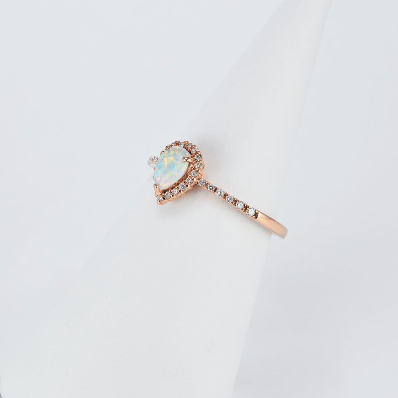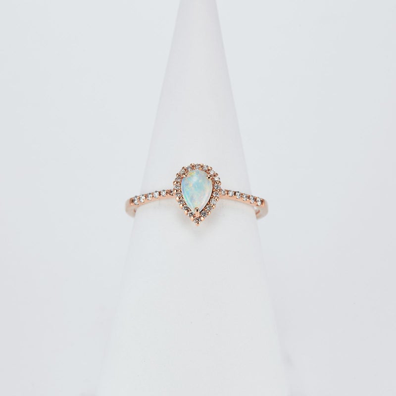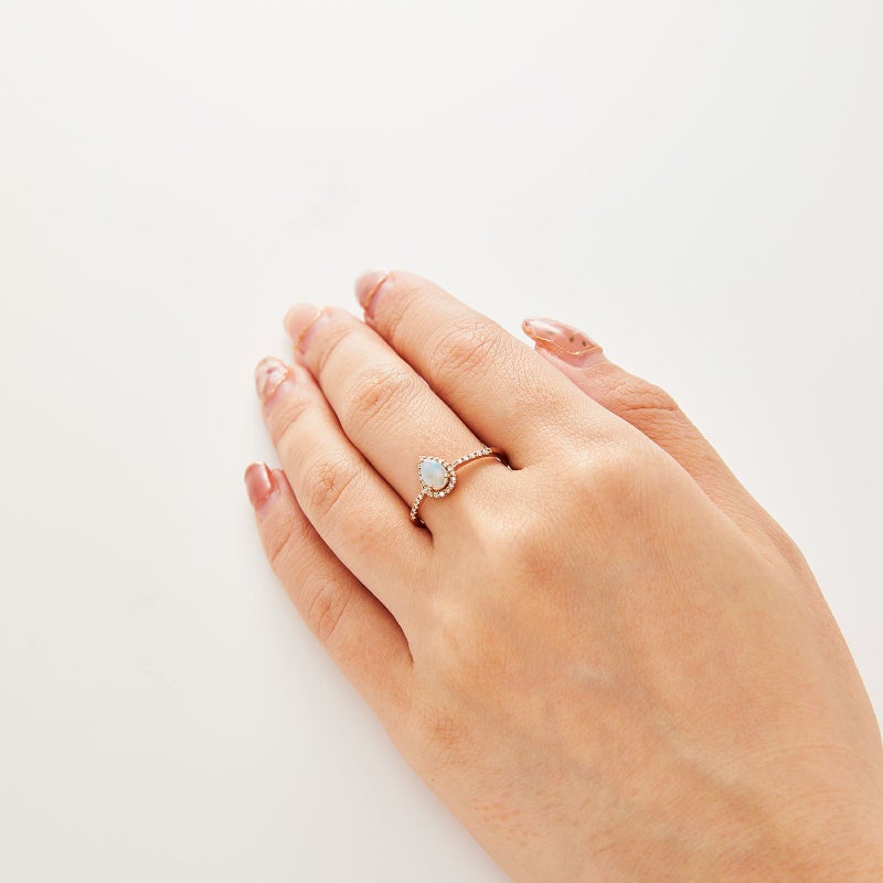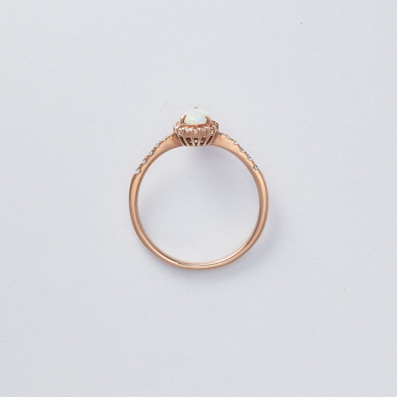 オパールをダイヤモンドで囲んだ美しいリングです。地金がピンクゴールドなので可愛らしい雰囲気が特徴です。
