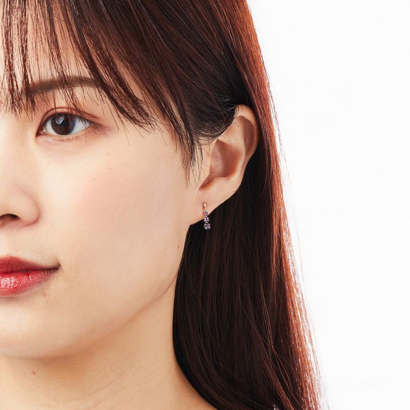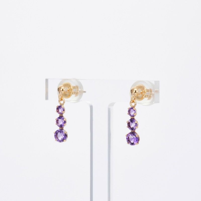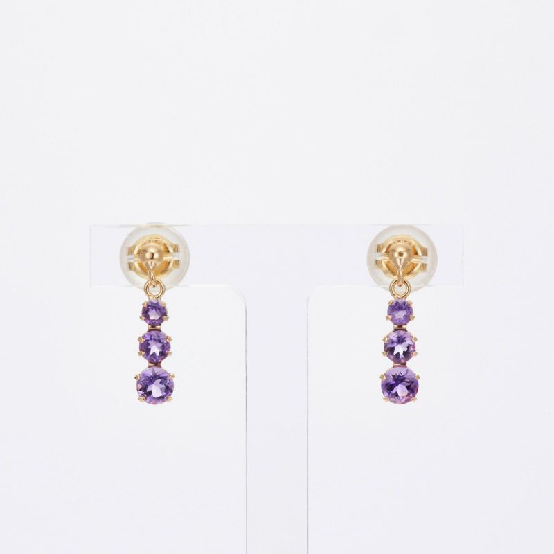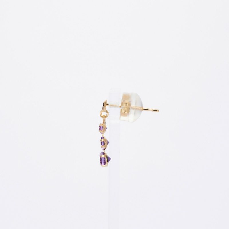大きさの違う3Pのアメジストをグラデーションにセットした大人可愛いピアスです。