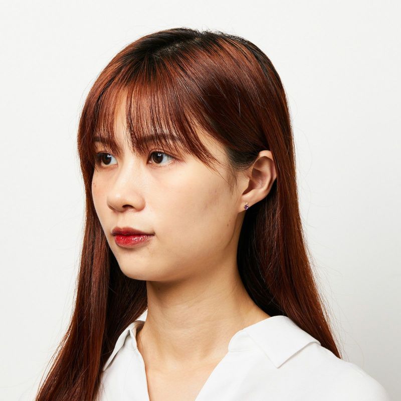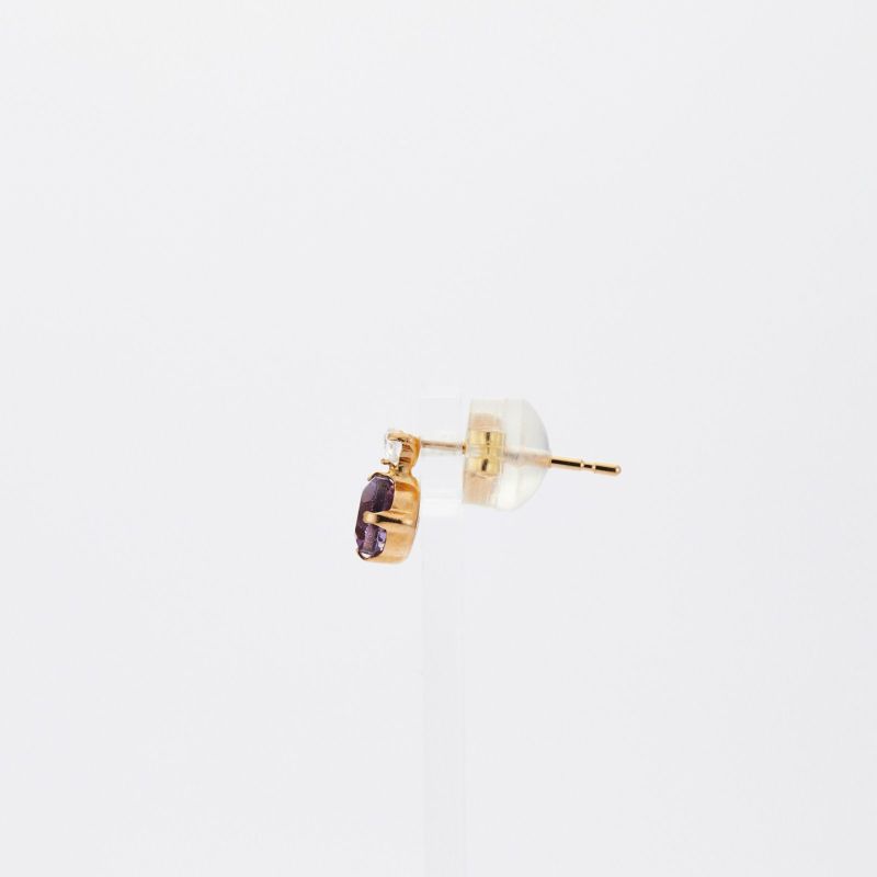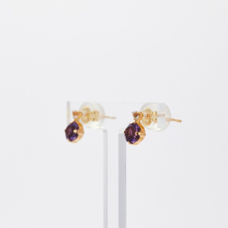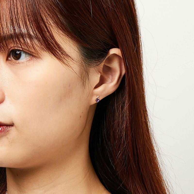 ラウンドカットのアメジストの上に、きらりと光る小さなホワイトトパーズがアクセント。顔周りにカラーストーンのジュエリーを使うと華やかな印象になります。恋のお守りと言われるアメジスト、叶えたい思いのある方にオススメです。