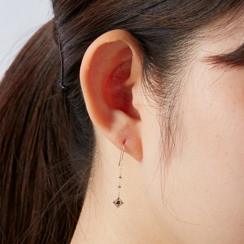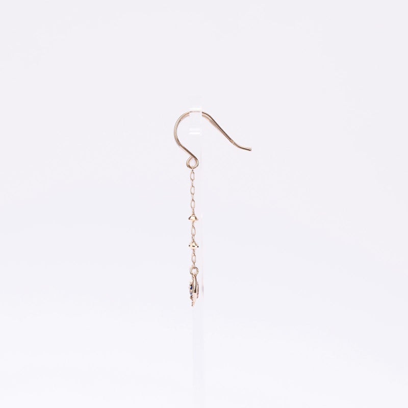 ヨーロッパの美術館の作品をモチーフにサファイアのピアスを仕上げました。宝石は地球の作品です。同じものは二つとない特別な宝石を、職人が一つ一つ丁寧に地金の額縁で縁取りました。揺れるたび宝石の色を楽しんで頂けるピアスです。