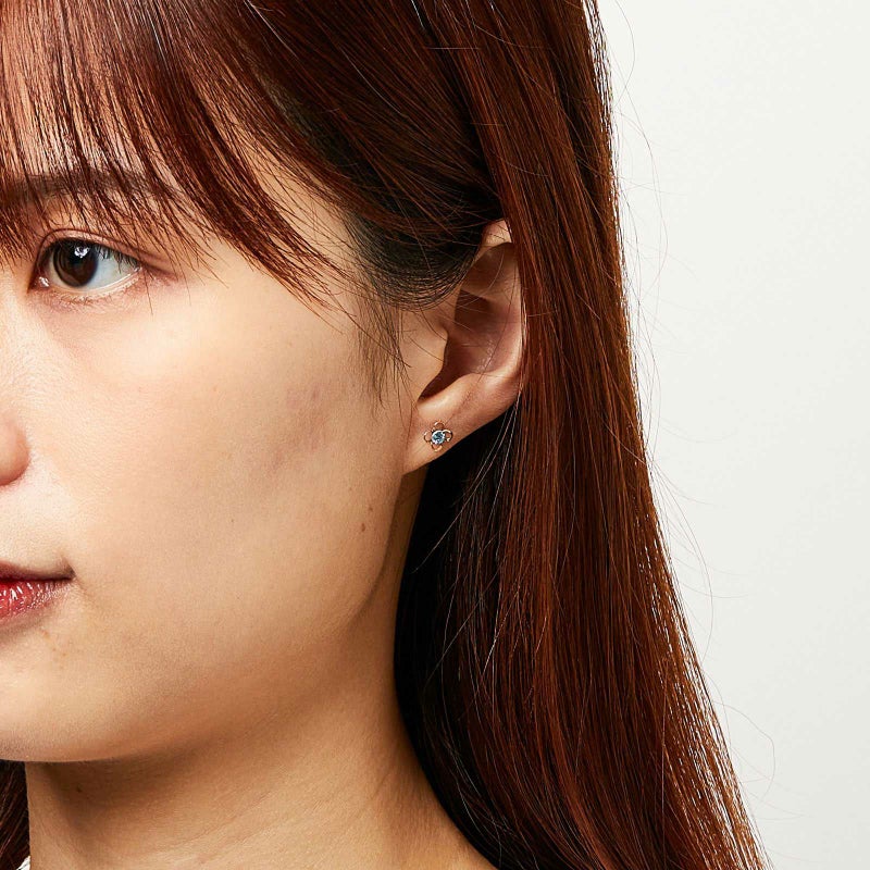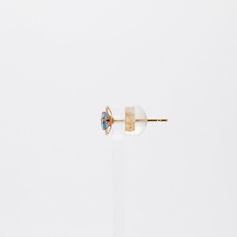 K18イエローゴールドのフラワーモチーフデザインのピアスです。4枚の花びらの中心にラウンドのブルートパーズが彩りを添えています。爽やかな色合いが素敵なピアスです。