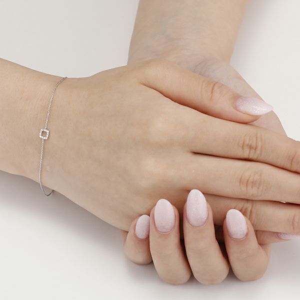スクエアの形にダイヤモンドをデザインして、上品なブレスレットに仕上げました。トップのモチーフが透けているので仰々しくならず、都会的な印象でお召いただけます。