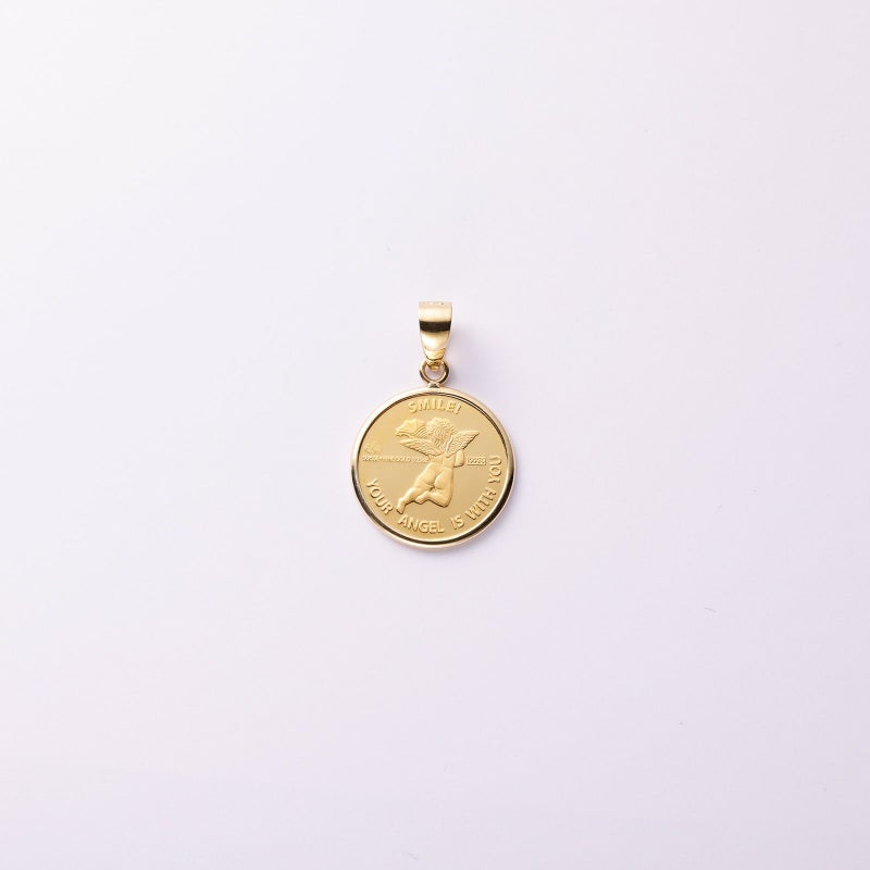 純金のコインを用いてペンダントトップを仕上げました。エンジェルのデザインをあしらったコインを使用しています。変わらない24金の輝きを楽しんでいただけます。