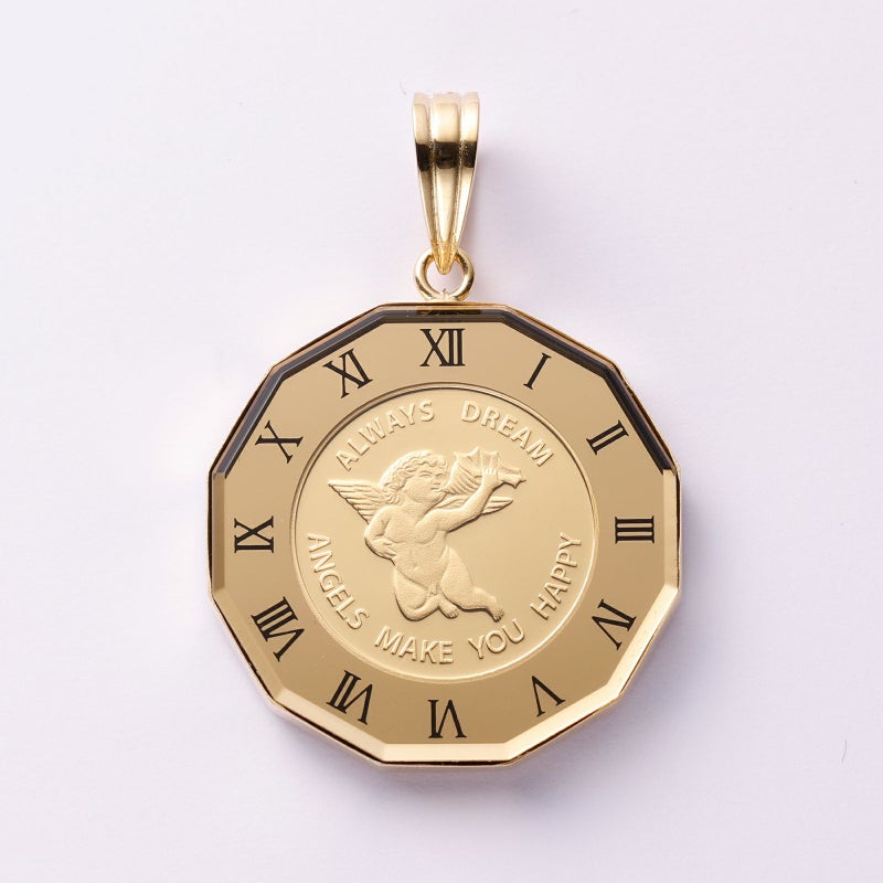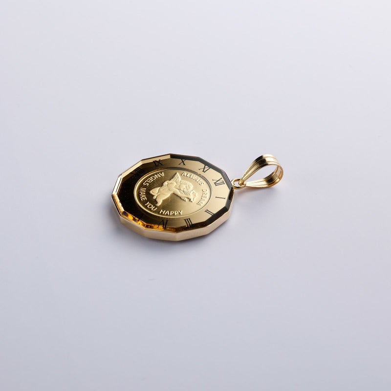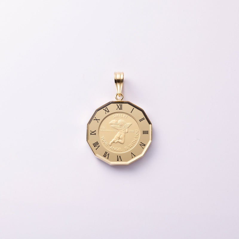純金のコインを用いてペンダントトップを仕上げました。エンジェルのデザインをあしらったコインを使用しています。ガラスで覆っていますので、変わらない24金の輝きを楽しんでいただけます。防水ではありませんので、お水に入ることはお控えください。