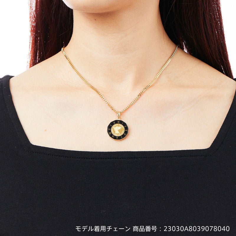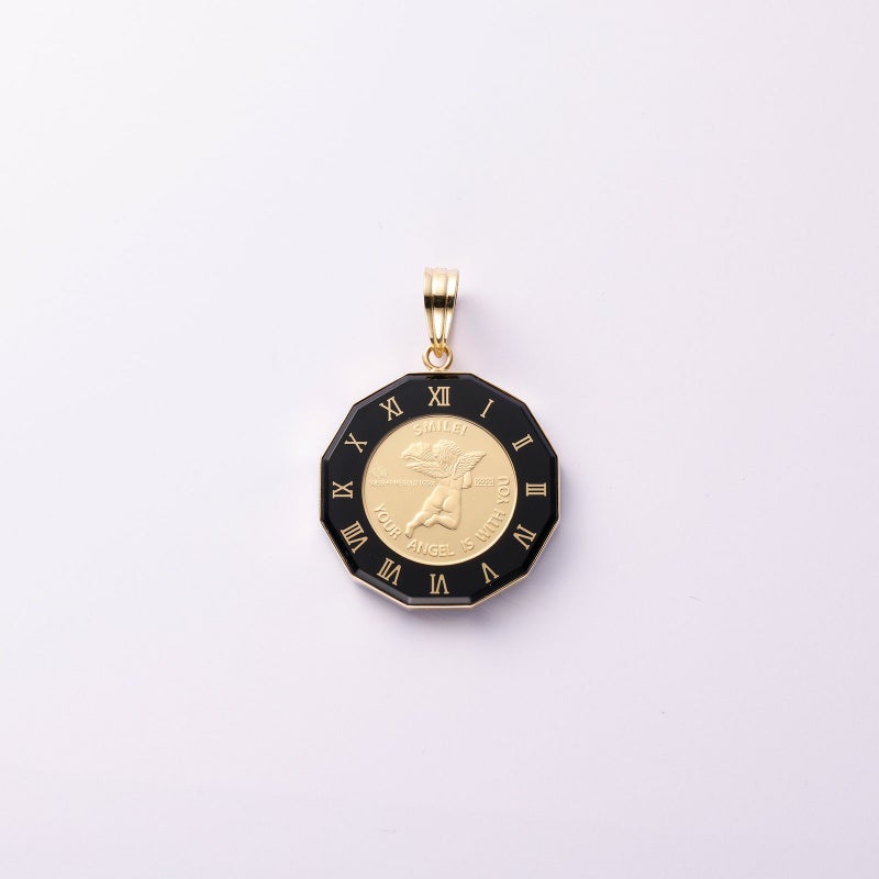 純金のコインを用いてペンダントトップを仕上げました。エンジェルのデザインをあしらったコインを使用しています。ガラスで覆っていますので、変わらない24金の輝きを楽しんでいただけます。防水ではありませんので、お水に入ることはお控えください。