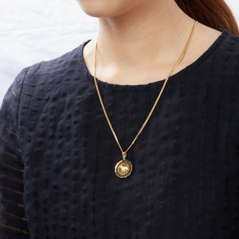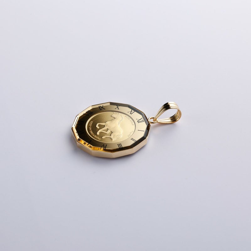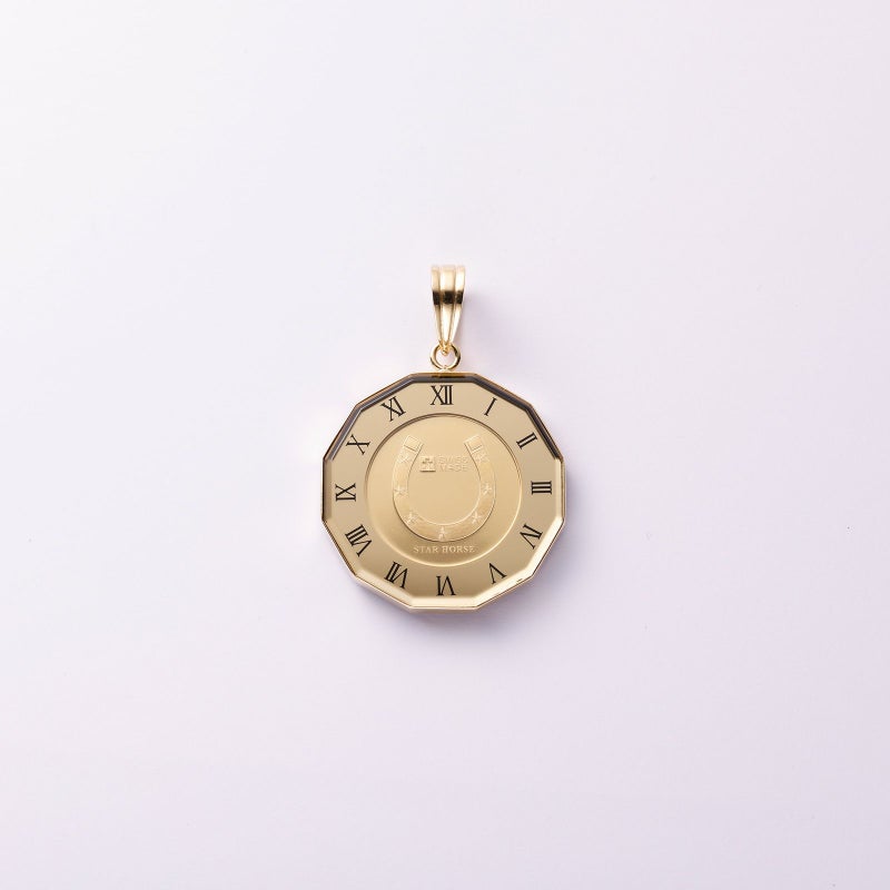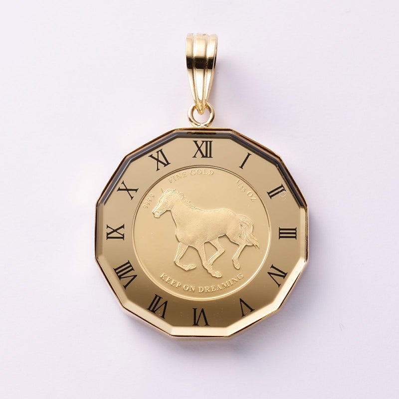 純金のコインを用いてペンダントトップを仕上げました。馬は武士の勝ちを運んでくることから、勝負運のモチーフとしてお召いただけます。ガラスで覆っていますので、変わらない24金の輝きを楽しんでいただけます。防水ではありませんので、お水に入ることはお控えください。
