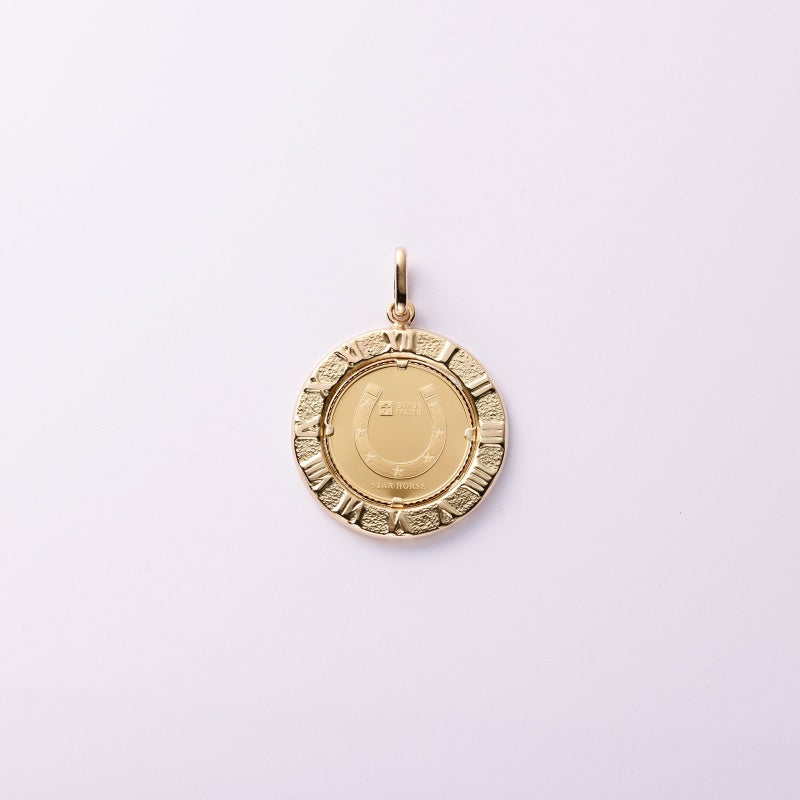 純金のコインを用いてペンダントトップを仕上げました。馬は武士の勝ちを運んでくることから、勝負運のモチーフとしてお召いただけます。24金の素材を楽しんで頂けます。