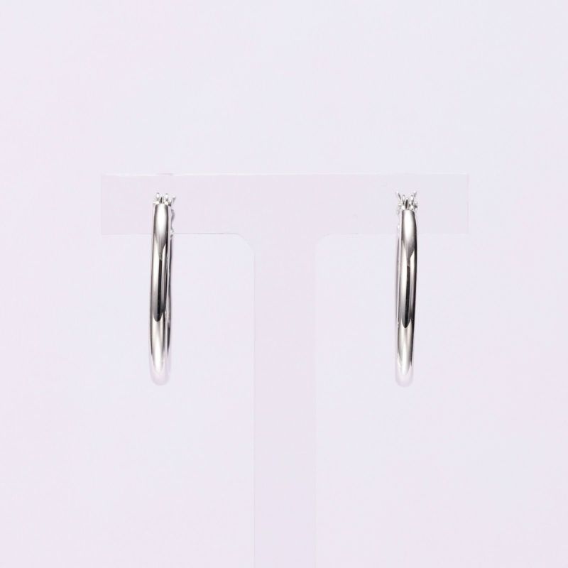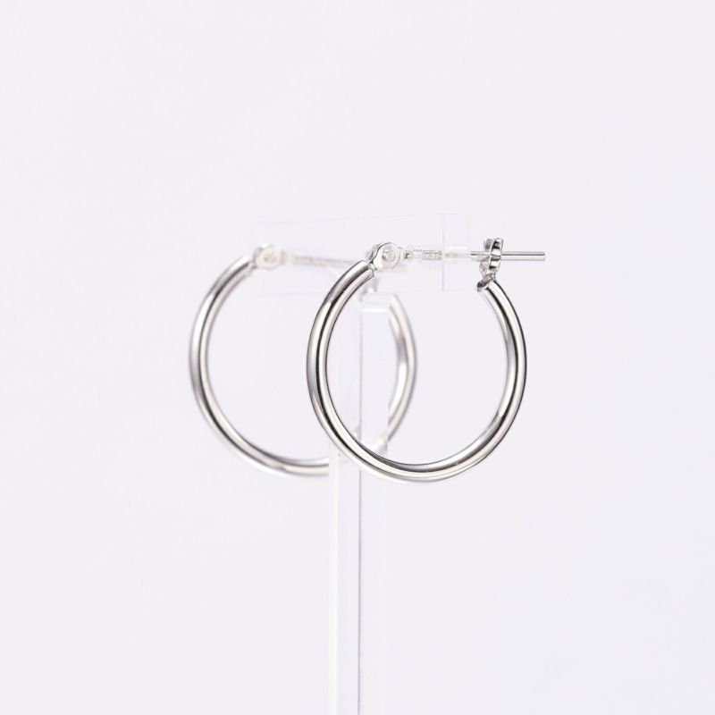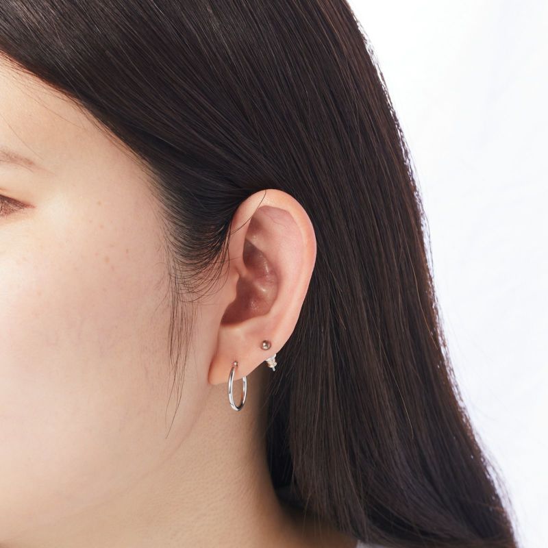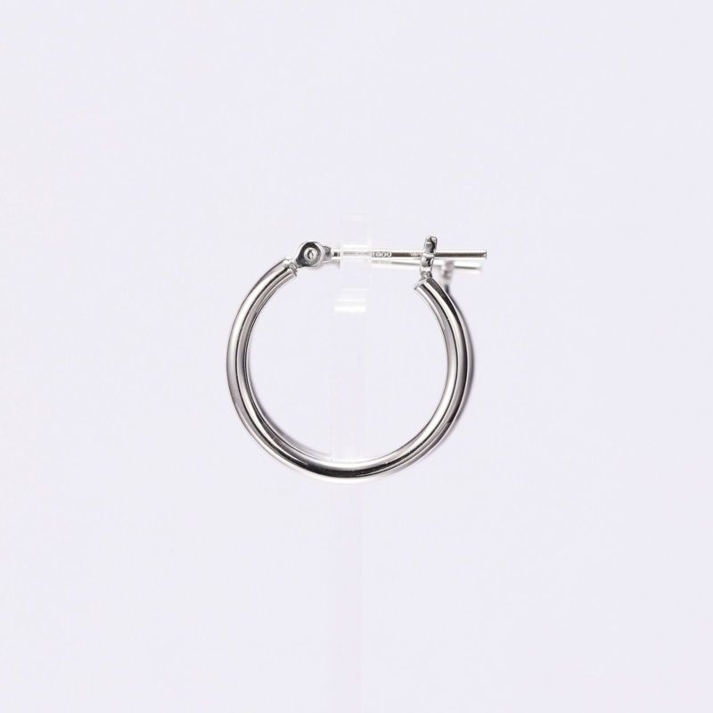 プラチナのフープピアス。控え目なプラチナのフープピアスは使いやすさ抜群でひとつ持っておきたいアイテムです。