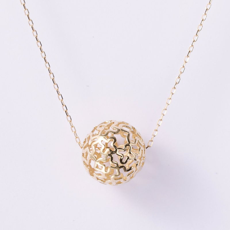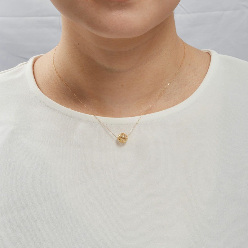 透けるメッシュのボールをペンダントトップにしました。K18イエローゴールドでお花畑をデザインしました。ダイヤモンドのきらめきはいらないけれど、華やかさは欲しいという要望にお応えできるデザインに仕上げました。