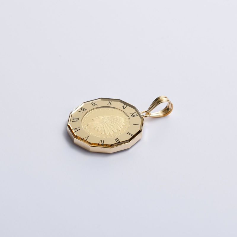 純金コインを用いてペンダントトップに仕上げました。気高いインディアンがモチーフです。コインの周りにデザインがあることでコインを大きく見せる効果があります。ガラス付の為、防水仕様ではありません。