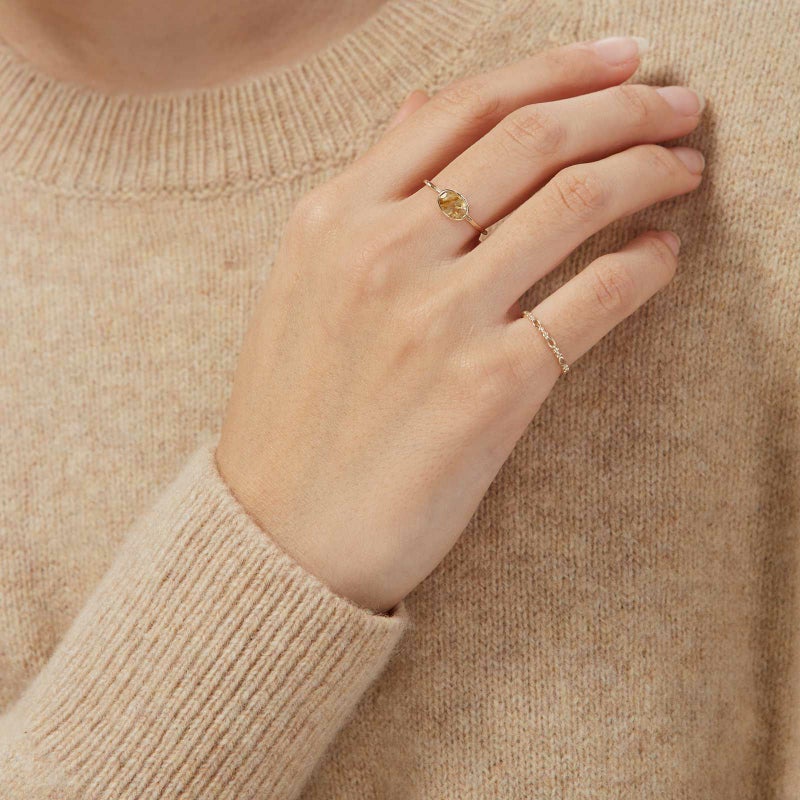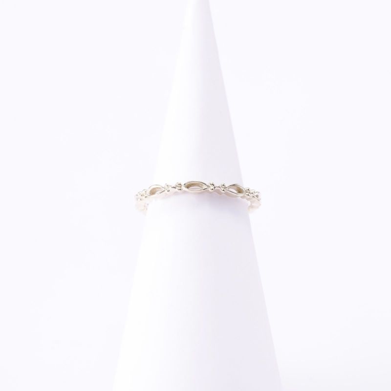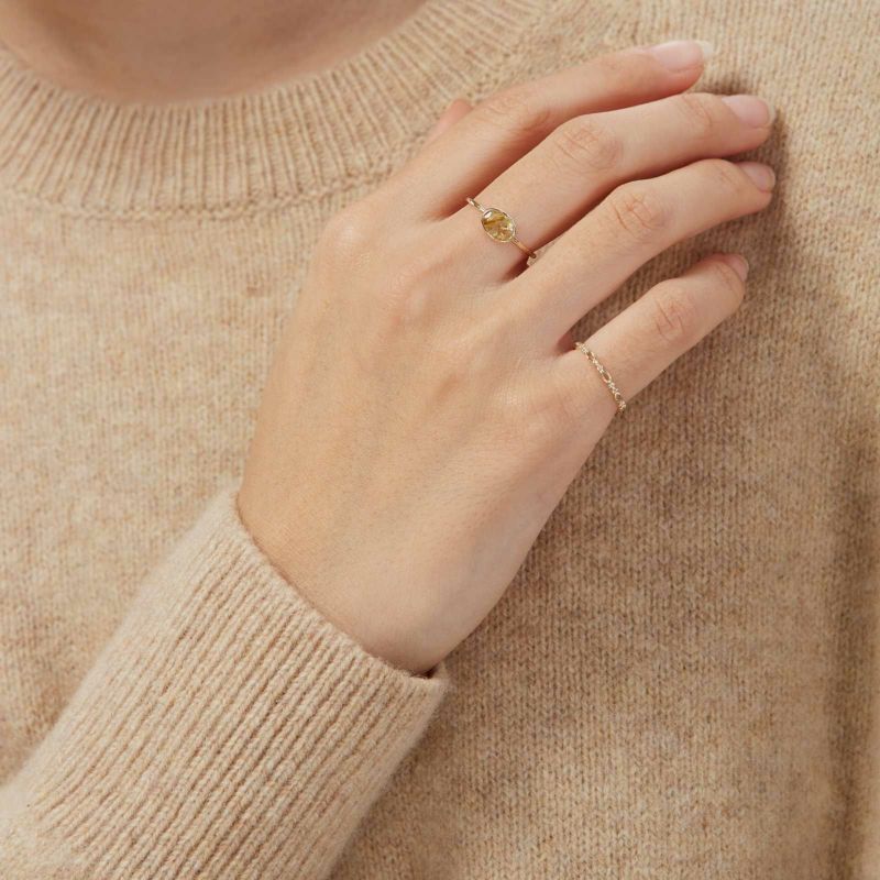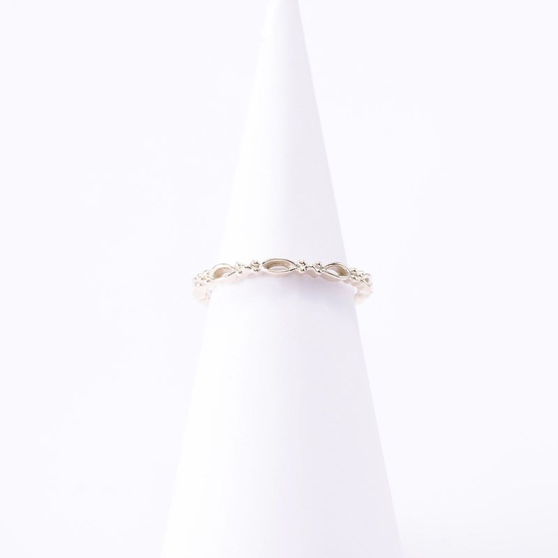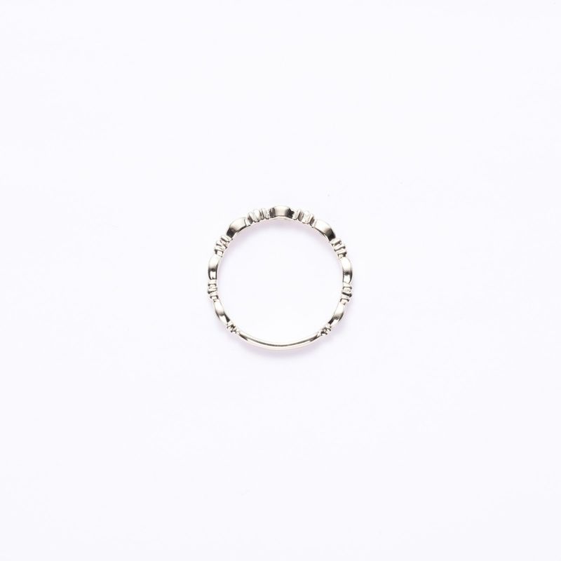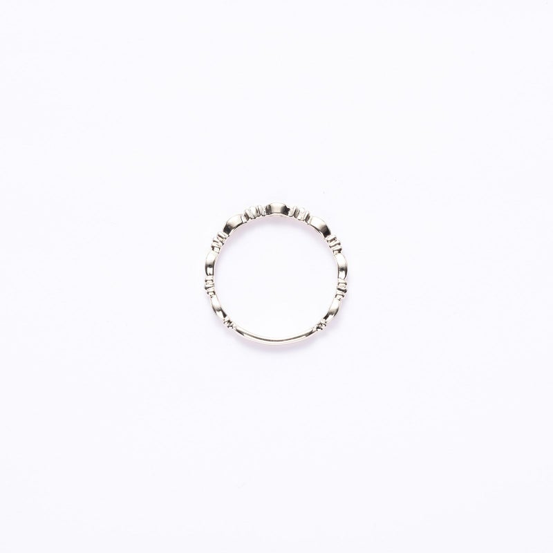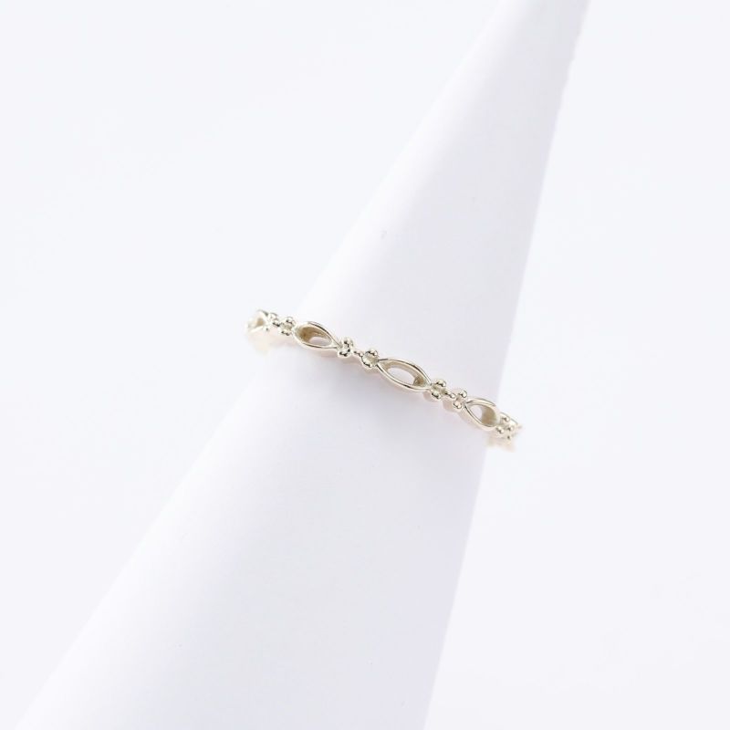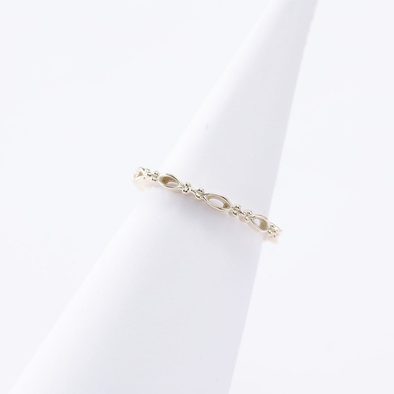 細身の透かしデザインが重ね着けのベースリングとしても合わせられます。上品な質感のゴールドが手元を華やかにしてくれます。