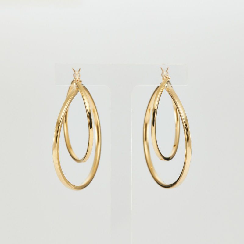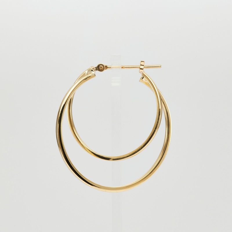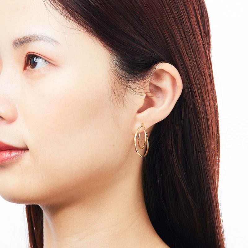 K18イエローゴールドのフープピアス。大きさ、デザインの違うフープが重なった華やかなピアスです。