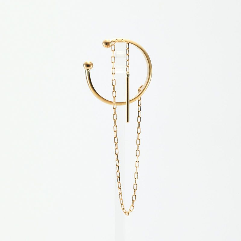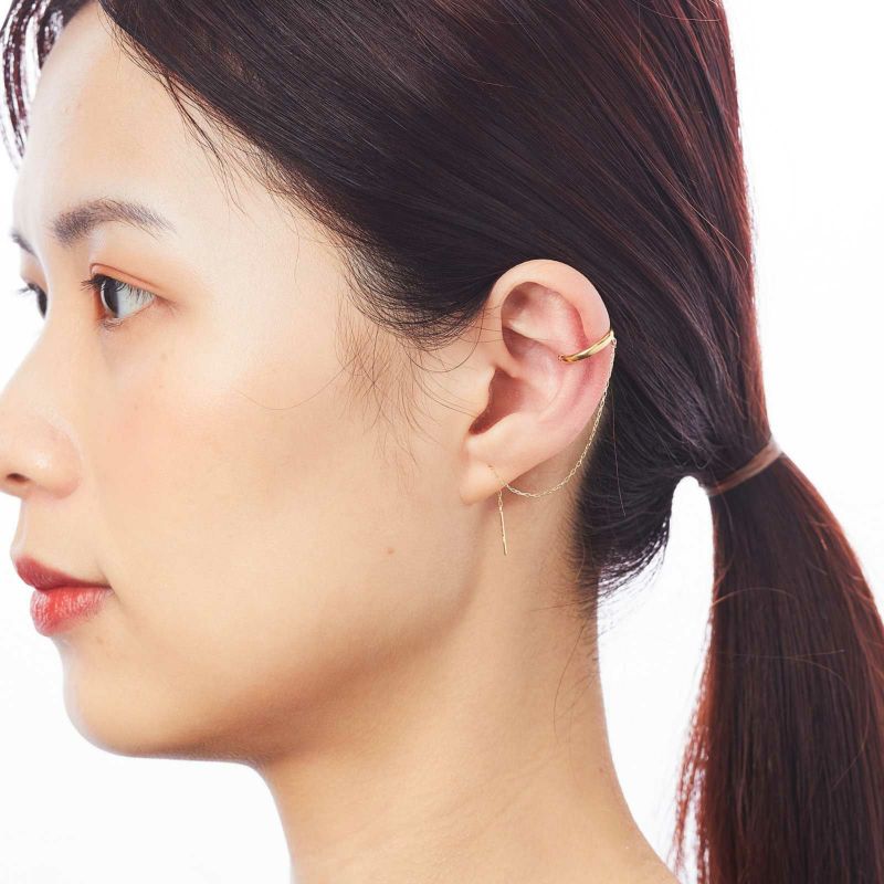 K18イエローゴールドのチェーン付きイヤカフ。フープのイヤカフに繋がったチェーンをピアスホールに入れてチェーンを垂らして着用するアイテム。華奢なチェーンが美しく輝くスタイリッシュなアイテムです。