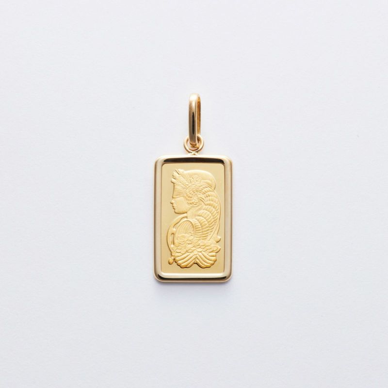 ローマ神話の幸運の女神【フォルトゥナ】のK24イエローゴールド 【1g】インゴットペンダントトップです。K18イエローゴールドのシンプル枠で存在感がありながら軽やかに胸元を飾ります。