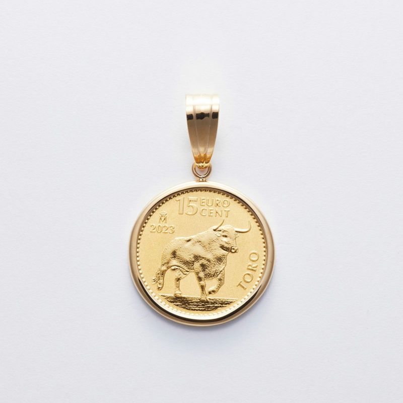 K24イエローゴールド /ブル ダブロン金貨 /トロ /15ユーロセント/ 2023年製 スペインマドリード王立スペイン造幣局発行のコインペンダントトップです。K18イエローゴールドのシンプル枠でありながら重厚感のある闘牛を引き立てたペンダントトップになっています。