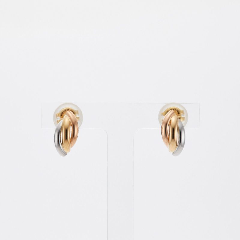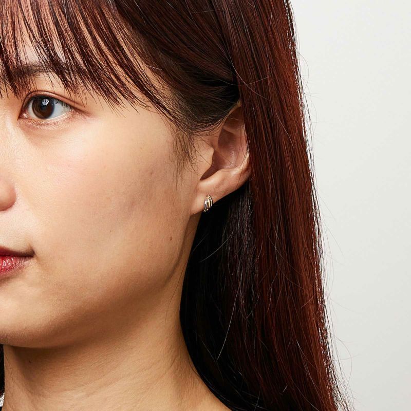 K18イエローゴールド/プラチナ900の地金ピアスです。3本の丸み帯びたラインが小振りながらもボリューム感を漂わせた着け心地の良いピアスです。