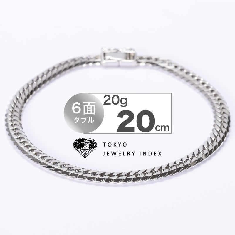 上下左右にカットを施した、輝きのある6面カットプラチナ喜平ブレスレットです。20gは幅広く見え、カットが多い分輝きが増すのが特徴です。20�Bと少し大きめなのでメンズジュエリーとして特におすすめですが、シンプルなチェーンはユニセックスにご愛用いただけます。独立行政法人造幣局の検定マーク(※ホールマーク)入り。