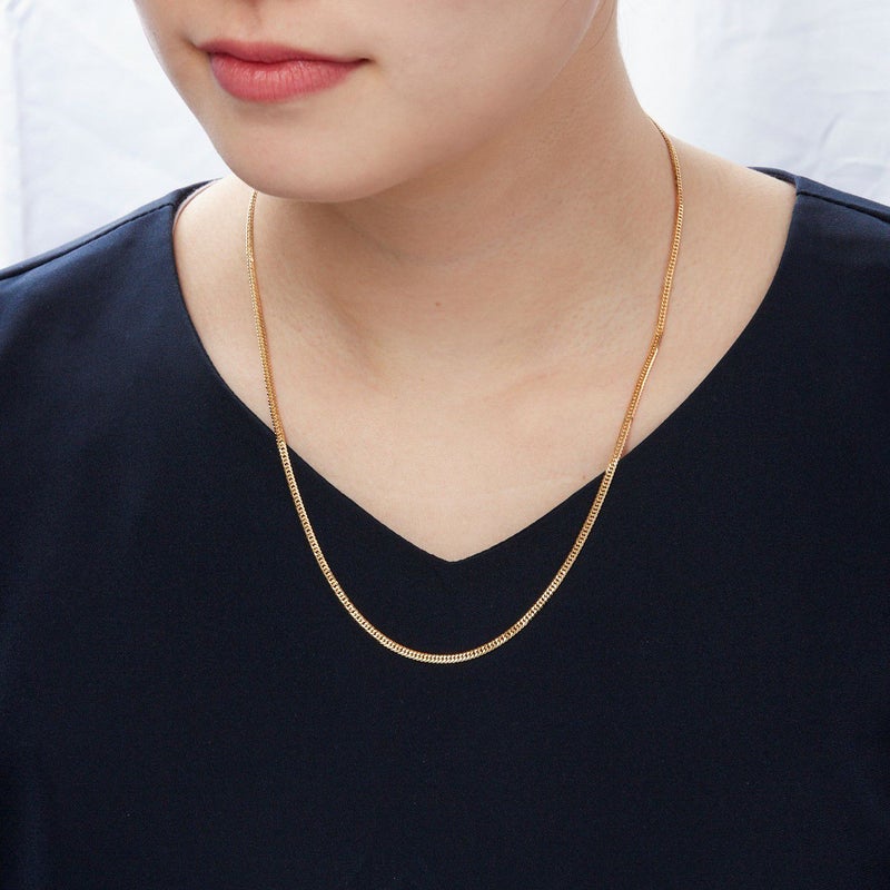 上下左右にカットを施した、輝きのある6面カット、ダブルの喜平ネックレスです。幅広く見え、カットが多い分輝きが増すのが特徴です。シンプルなチェーンはユニセックスにご愛用いただけます。独立行政法人造幣局の検定マーク(※ホールマーク)入り。