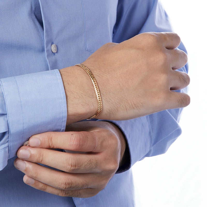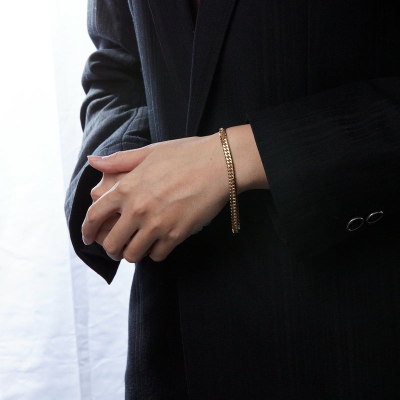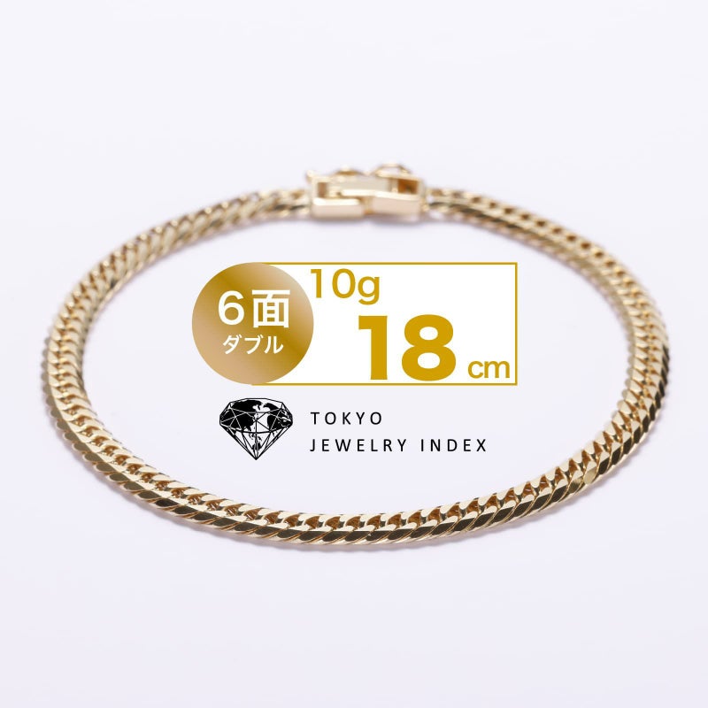 上下左右にカットを施した、輝きのある6面カット喜平ブレスレットです。幅広く見え、カットが多い分輝きが増すのが特徴です。10gのシンプルなチェーンはユニセックスにご愛用いただけます。独立行政法人造幣局の検定マーク(※ホールマーク)入り。