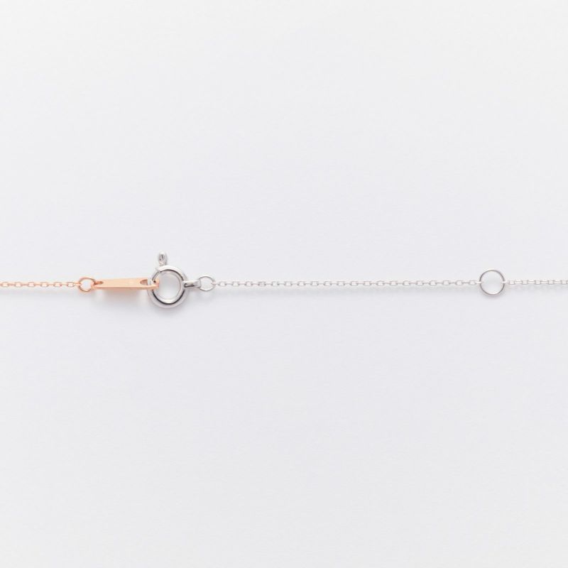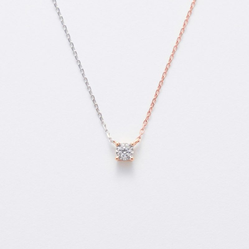 最もシンプルな一粒石ダイヤペンダントに遊び心を。左右のチェーン、トップをホワイト、ピンク、イエローの3色を使ったクレイジーパターンネックレス。