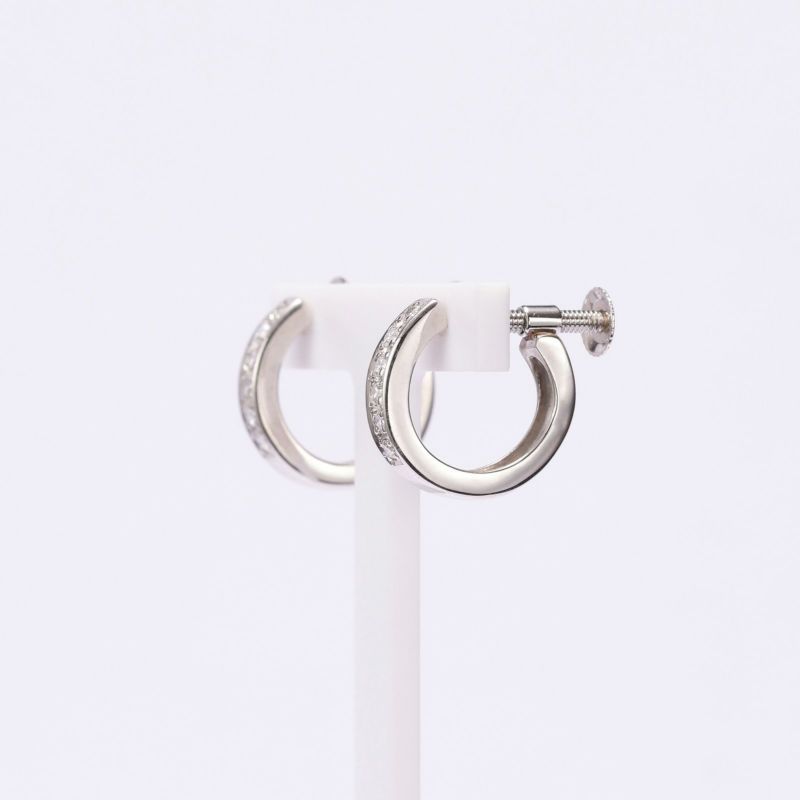 プラチナのフープイヤリングをデザインしました。ダイヤモンドを引っ掛かりの無いように縦に配置してあります。ダイヤモンドのきらめきと、プラチナの上品な輝きを両方楽しんで頂けるミニマルなデザインに仕上がりました。