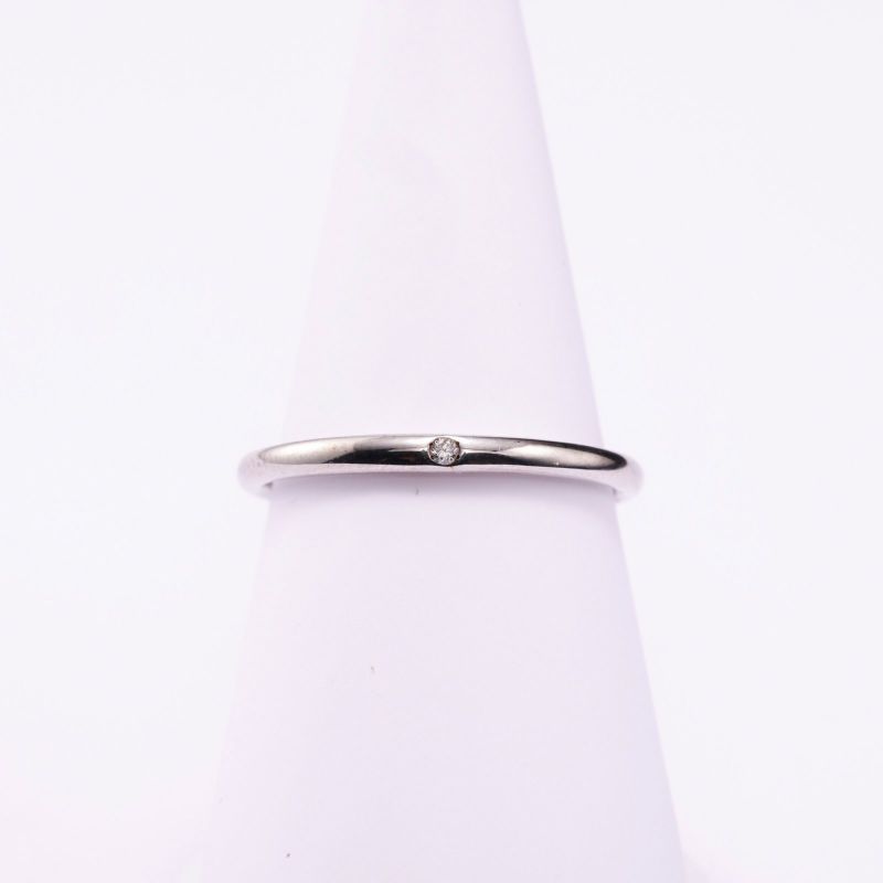 シンプルな甲丸のリングにダイヤモンドを一石留めたデザインです。重ねても一本でもお召いただけます。プレゼントとしてもおすすめです。