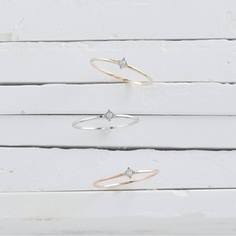 4本の爪にダイヤモンドがセッティングされたシンプルで美しいリング。華奢なサイズ感だからレイヤードにもおすすめ。
