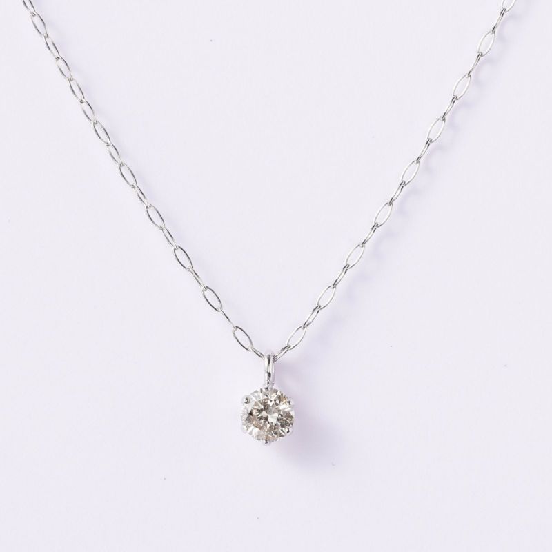 0.1ctダイヤモンドネックレスです。チェーンを繊細にして、石が最大限目立つデザインを目指しました。プラチナの上品な輝きとダイヤモンドのきらめきを両方お楽しみください。