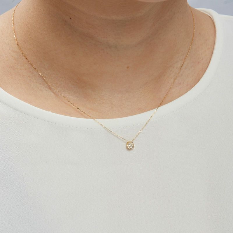 ダイヤモンドを7石使って、ネックレスをデザインしました。7石のダイヤモンドには、幸運の意味があります。チェーンとダイヤモンドだけでネックレスをデザインしましたので、きらめきの強い一粒のようにも見え、どんな服装にも合うネックレスです。