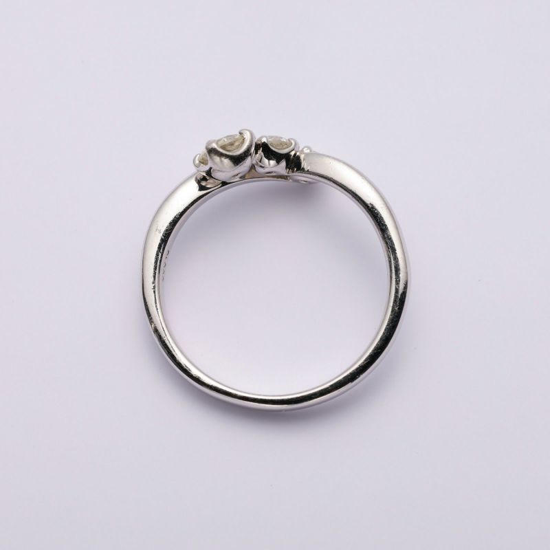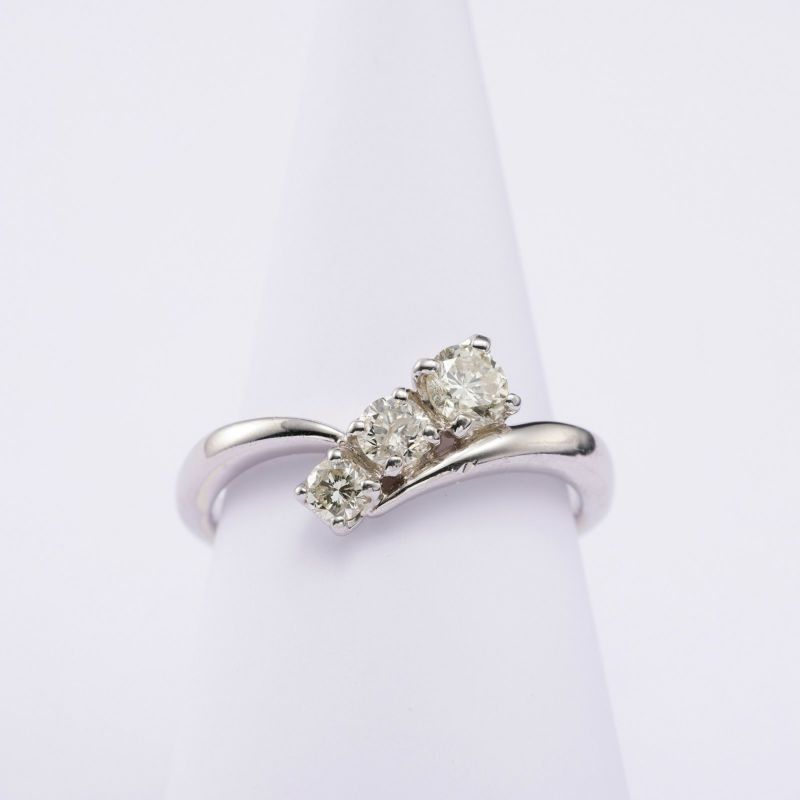 ダイヤモンドのスリーストーンリングのご紹介です。スリーストーンは、過去、現在、未来を表します。斜めのラインにセッティングされているのでとても都会的で洗練された上品な印象でお召し頂けます。