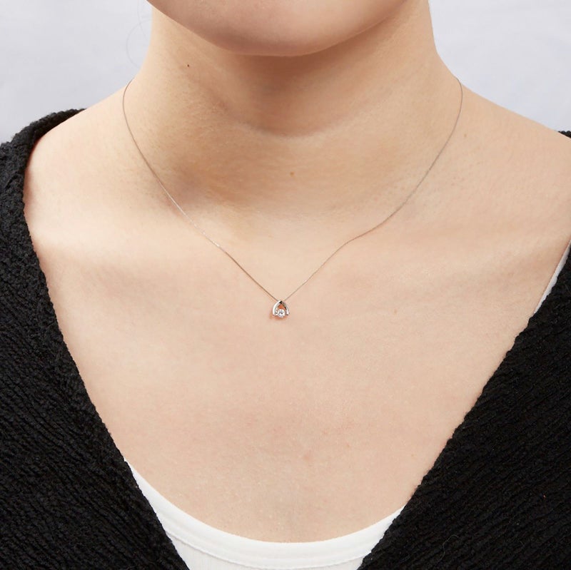 末広がりのシャープなペンダントトップに、ダイヤモンドを留めたダンシングストーンネックレスです。