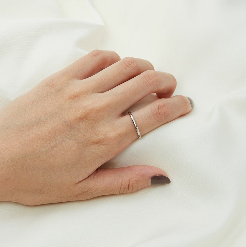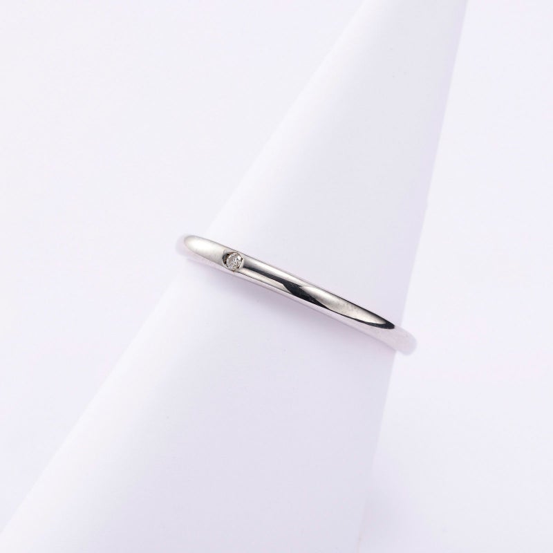 シンプルな甲丸のリングにダイヤモンドを一石留めたデザインです。重ねても一本でもお召いただけます。プレゼントとしてもおすすめです。