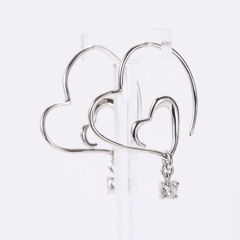 ハンドメイドのハート型のピアスです。横から見たときにハートになるように地金をデザインしました。ダイヤモンドのチャームはゆらゆら揺れて華やかさを演出してくれます。職人の手で創り出すハンドメイドならではの味のあるデザインをお楽しみください。