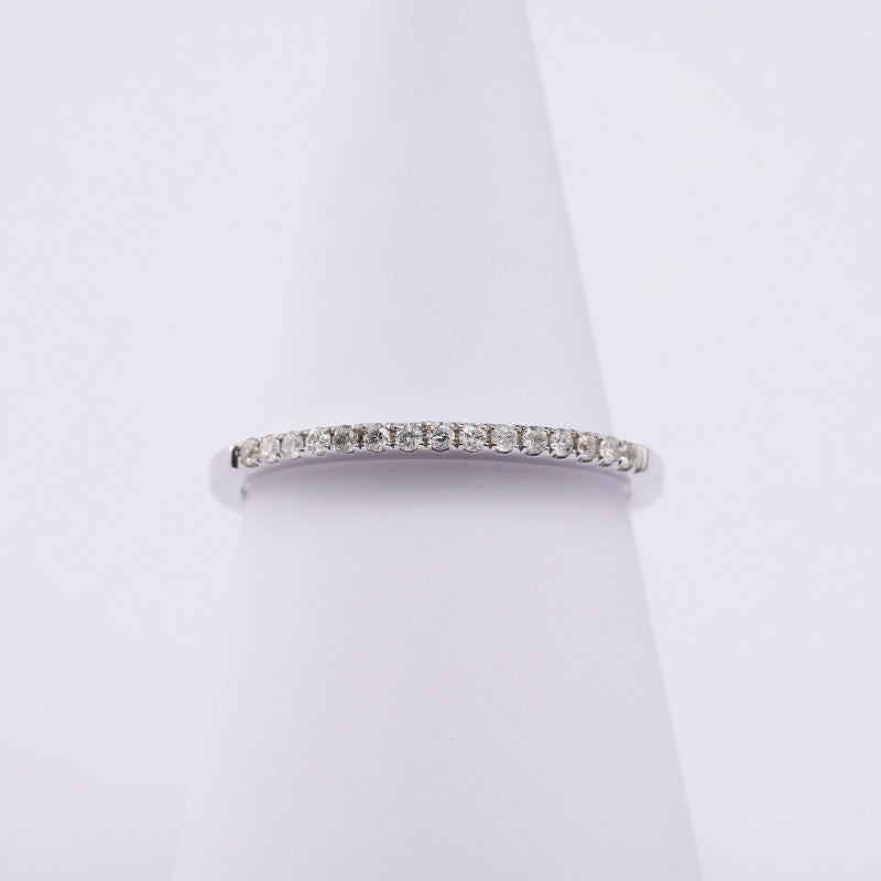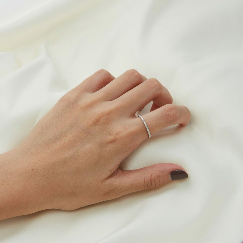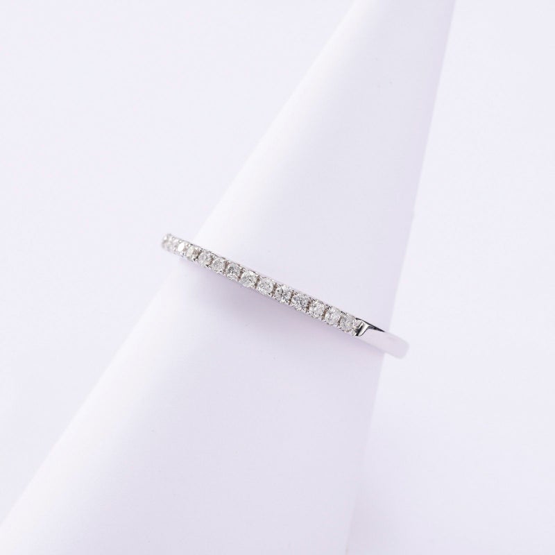 一列のハーフエタニティラインリングをご用意しました。地金いっぱいに広がるダイヤモンドを楽しんでいただけます。ミニマルなデザインですので、重ね付けをされも、1本だけでお召しになっても満足感のあるリングです。
