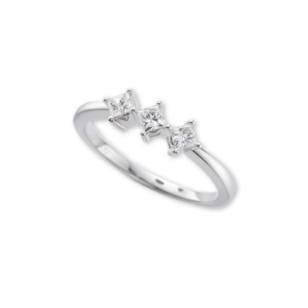 大粒のスクエアダイヤモンドが3つあしらわれた、贅沢なリング。うっとりするほど美しいその佇まいは、身に着ける女性をまるでプリンセスのように輝かせてくれる。
