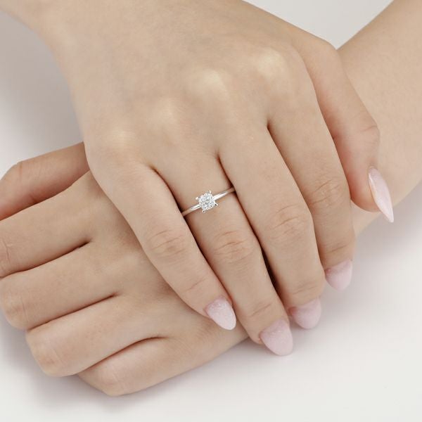 なめらかなプラチナの土台に10個、さらにセンターストーンを支える爪の側面に12個ものダイヤモンドが贅沢にあしらわれた憧れリング。一生に一度は身につけたい。