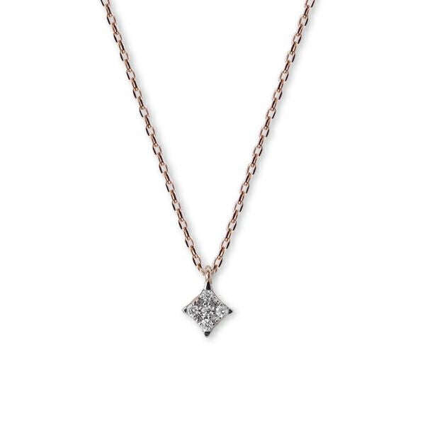 小粒ながら細部にこだわったダイヤ型ペンダント。肌なじみの良いピンクゴールドでシーンを選ばず使える。