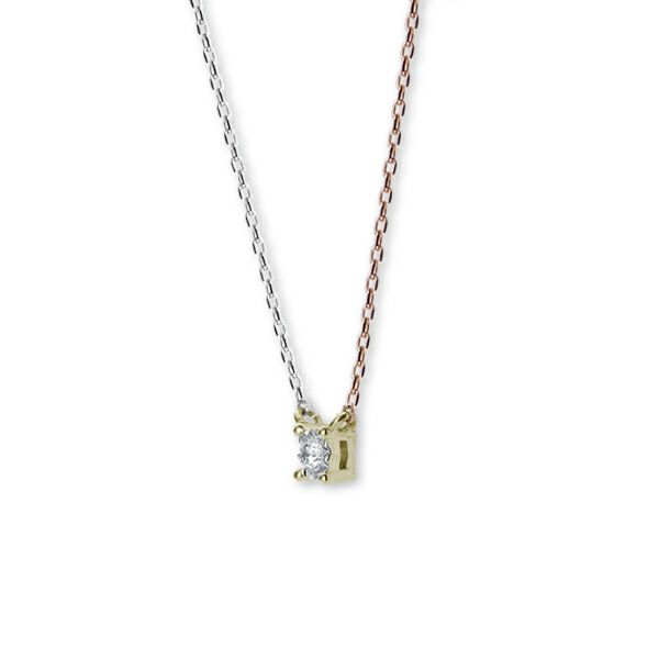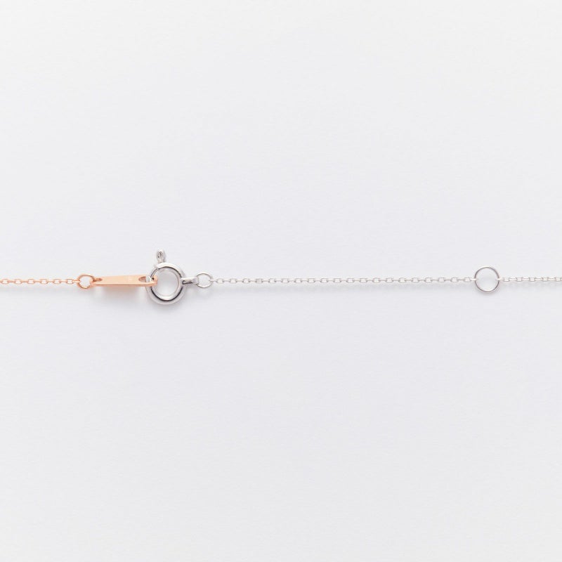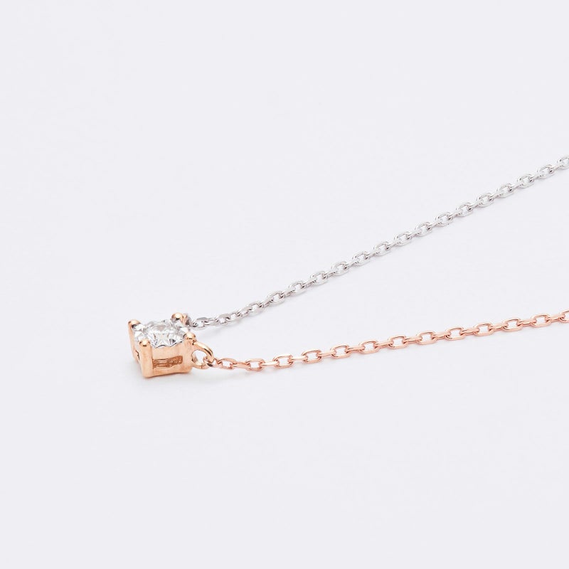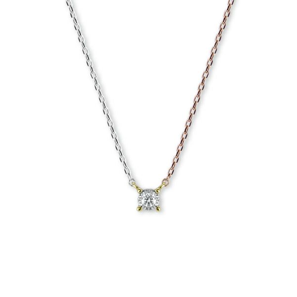 最もシンプルな一粒石ダイヤペンダントに遊び心を。左右のチェーン、トップをホワイト、ピンク、イエローの3色を使ったクレイジーパターンネックレス。