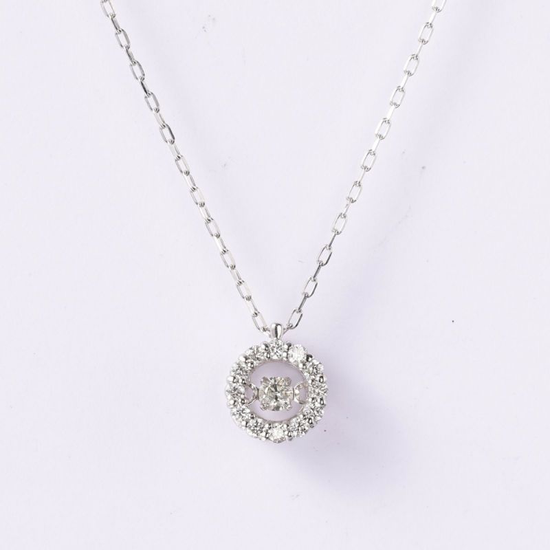 サークルモチーフにダイヤモンドが留まったダンシングストーンネックレスです。強い光を放つので、コーディネートの中心になります。プラチナを使用していますので、品の良い輝きも楽しんでいただけます。