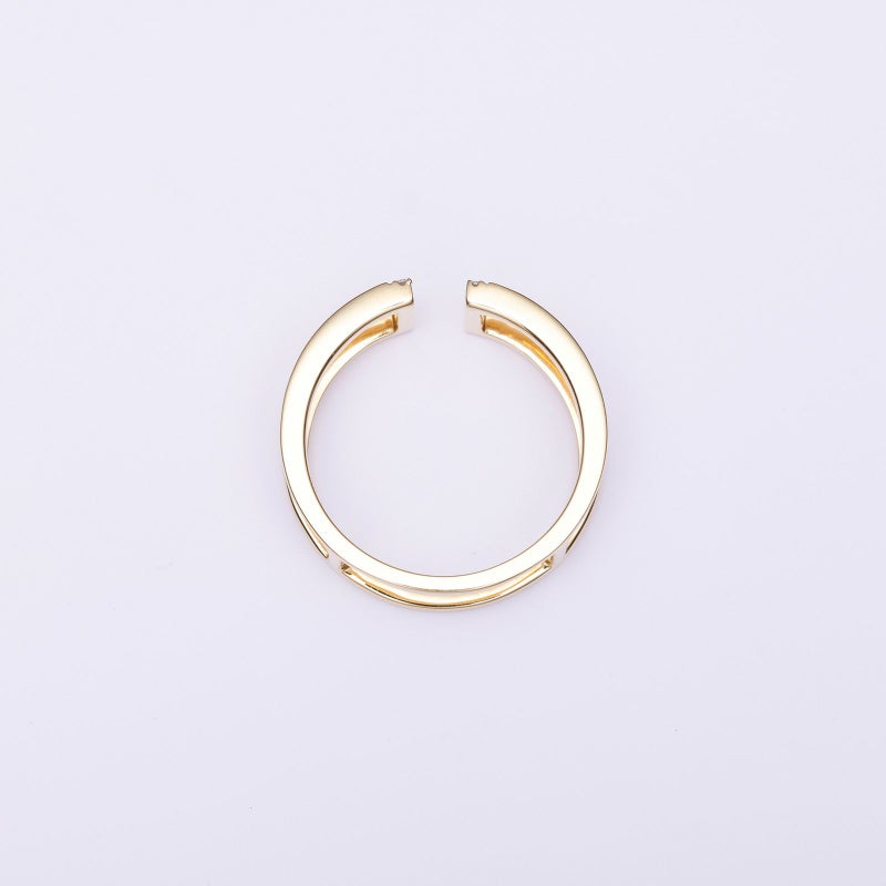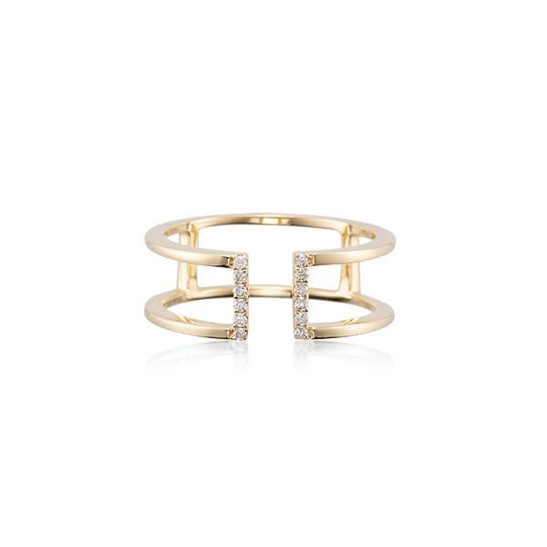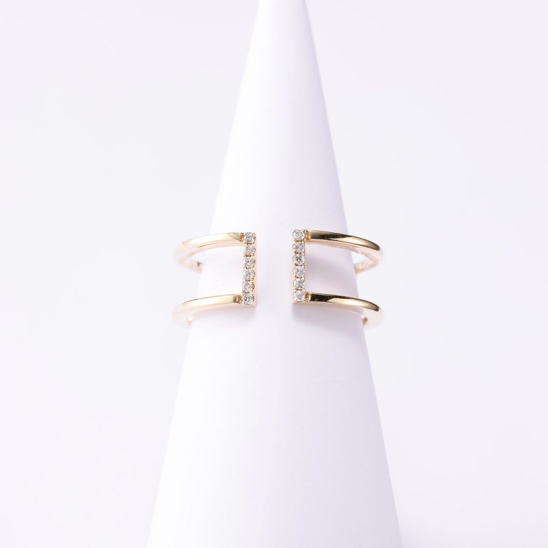 K18イエローゴールドのリングです。都会的な幅広のデザインで、ダイヤモンドとイエローゴールドのラインのみで指輪をデザインしてあります。余計な物が何もないので、どんな服装にもあわせて頂けます。