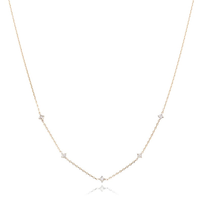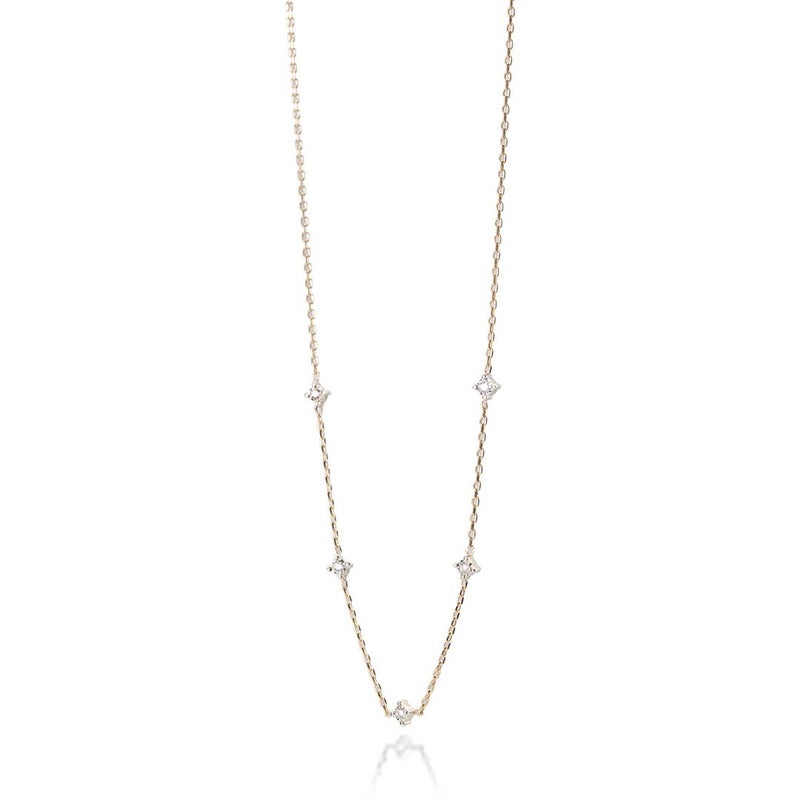ダイヤモンドをステーションネックレスにデザインしました。ダイヤモンドが留まった台はホワイトゴールドになっています。石が動いても裏側っぽくならず、一様なデザインでお召いただけます。