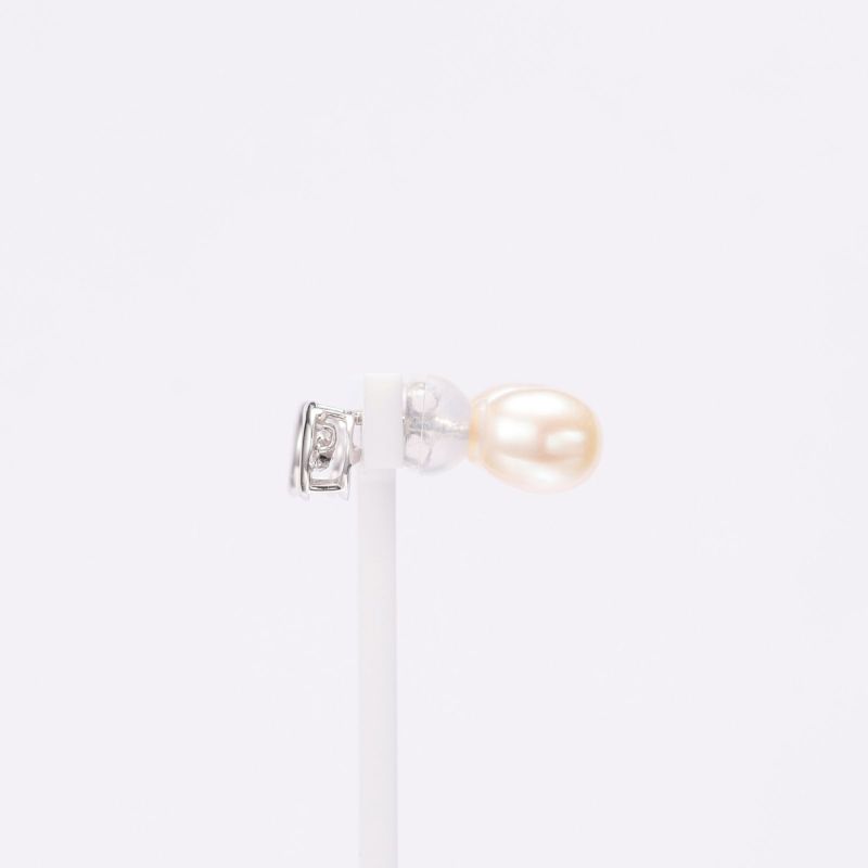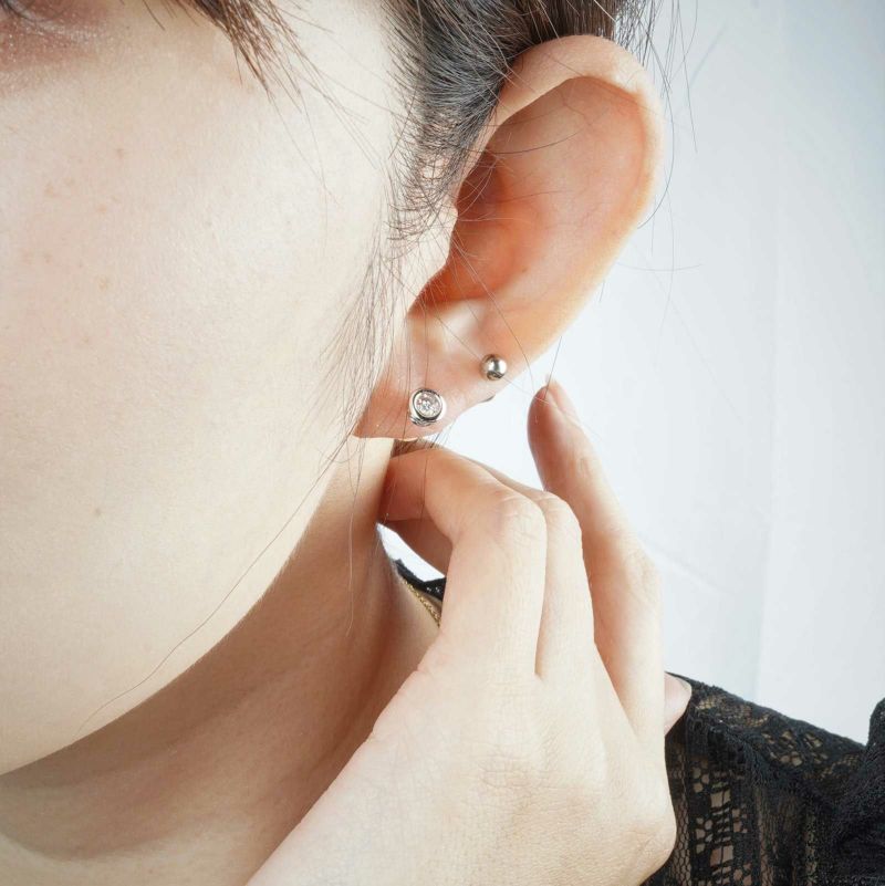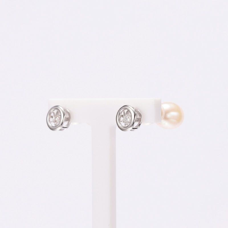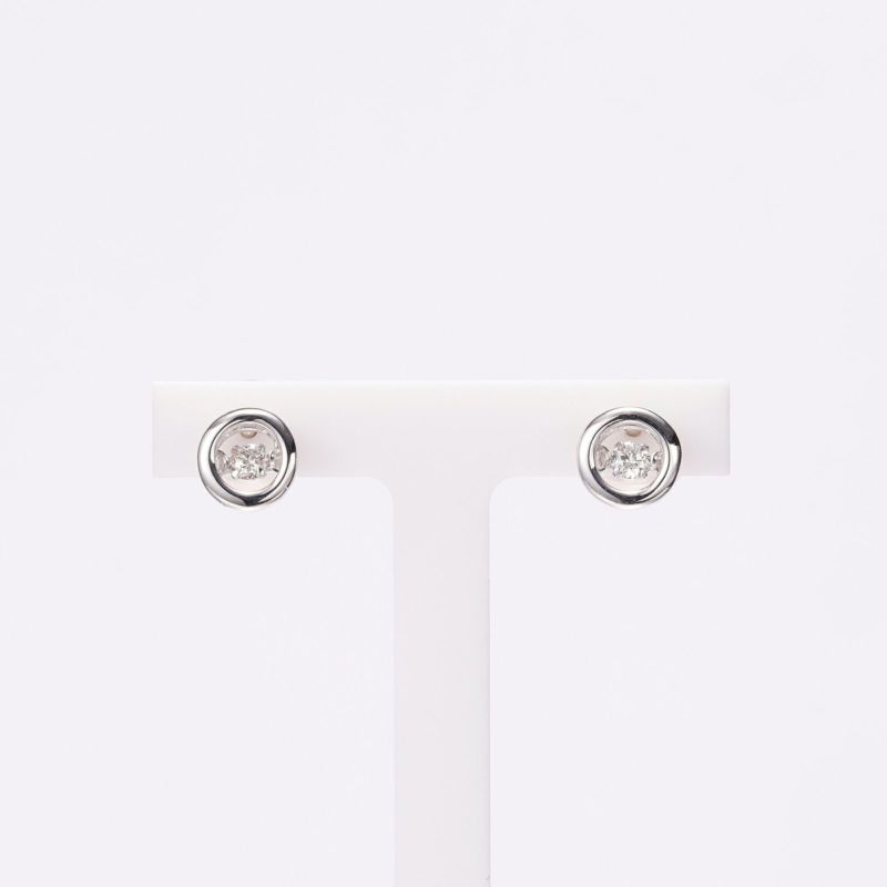 サークルモチーフの中に揺れるダイヤモンドをセッティングしました。ダンシングストーンは揺れるたびに光を捕まえて、強いきらめきをお楽しみいただけます。光を反射しますので、お顔までぱっと明るくなります。淡水パールのキャッチも差し上げます。お好きなキャッチをお使いください。