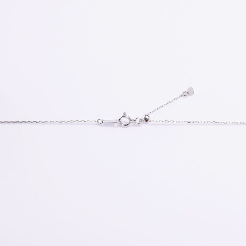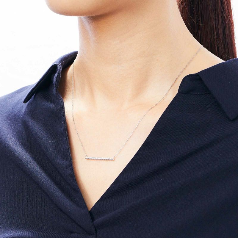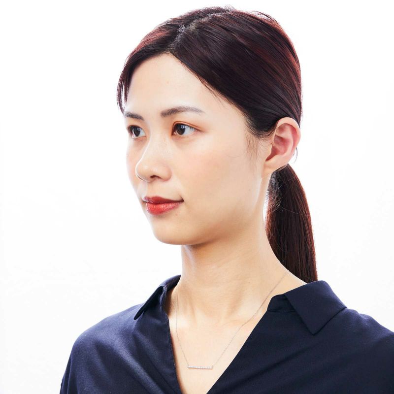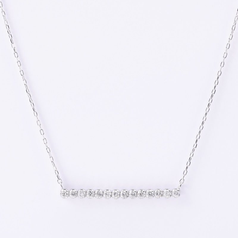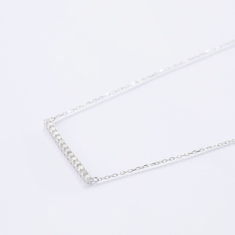 0.3カラットのダイヤモンドを横に配置したネックレス。横ラインタイプのネックレスはデコルテに載せてあげると鎖骨が綺麗に見える効果もあると言われています。