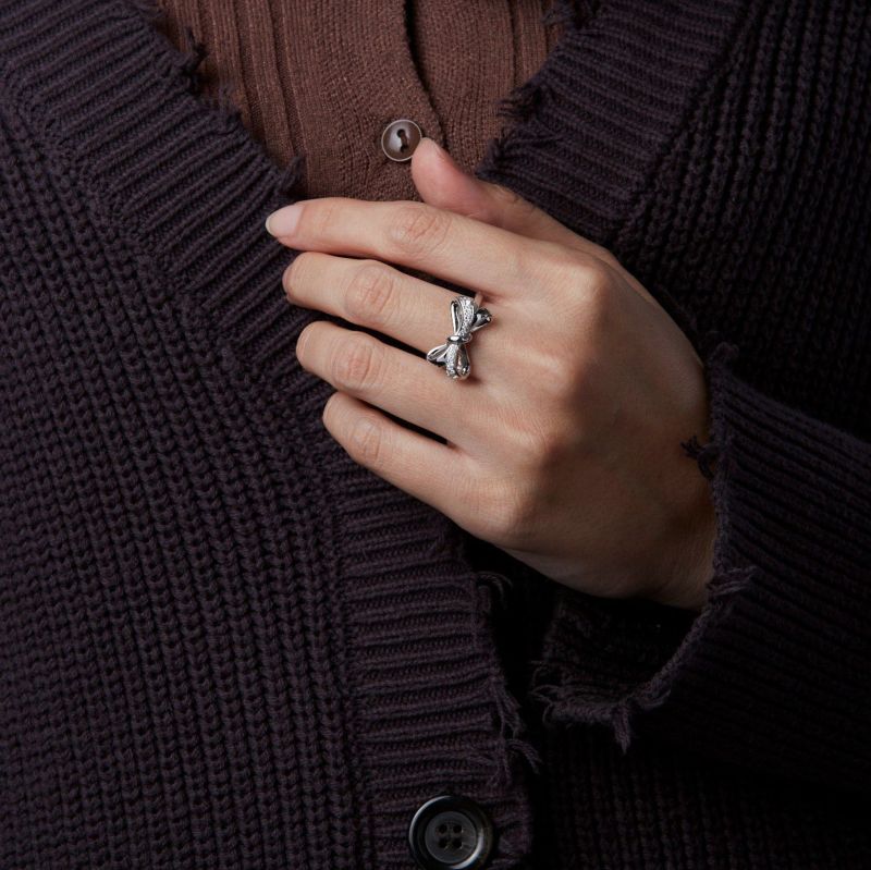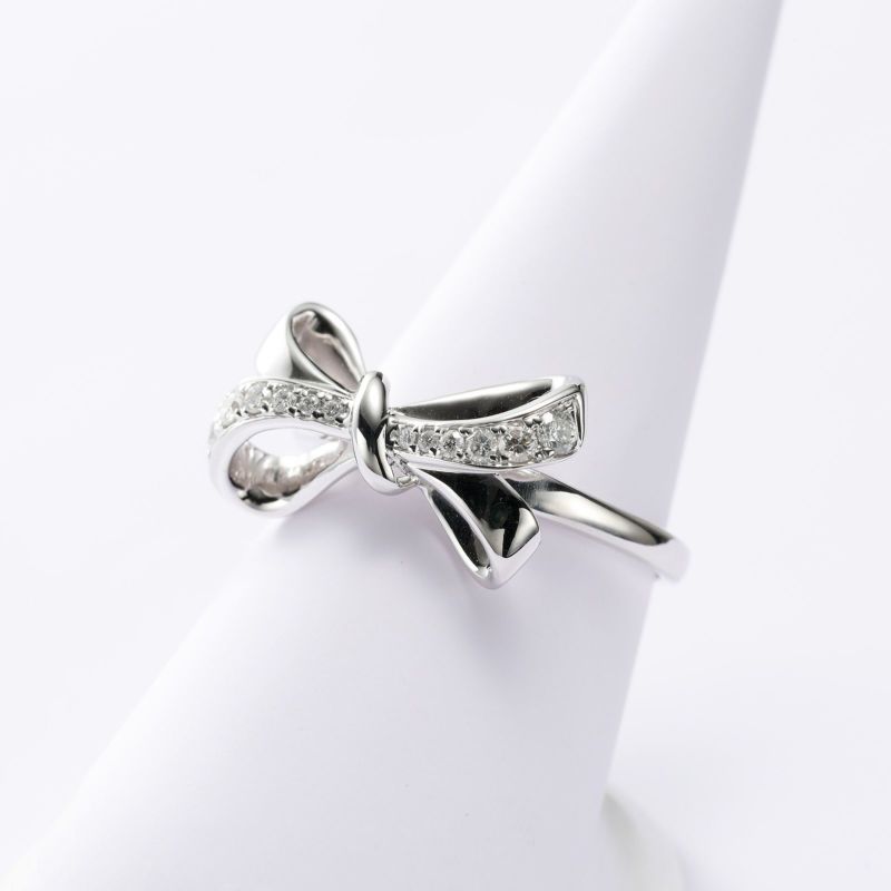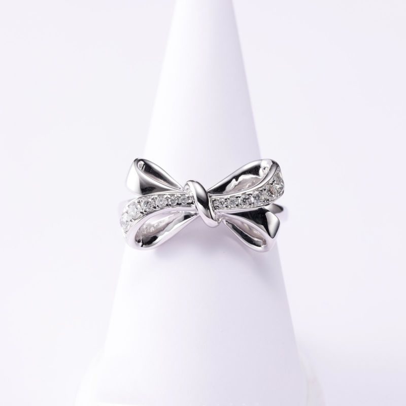 たおやかなリボンをモチーフにしたリングのご紹介です。一列がダイヤモンド、もう一列が地金のラインでデザインしています。しなやかなリボンの質感を地金で表現しました。