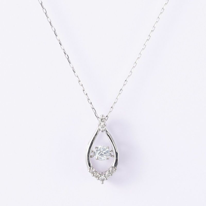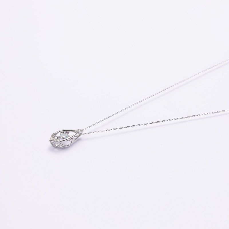 ペアシェープ型のモチーフにアイスブルーダイヤモンドをセッティングしたネックレスです。胸元で揺れる青い石をお楽しみください。