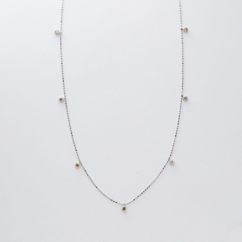 K18ホワイトゴールドのステーションネックレス。合計0.3ctのダイヤモンドが散りばめられたネックレスはコーディネートのアクセントになる1本持っておきたいアイテムです。
