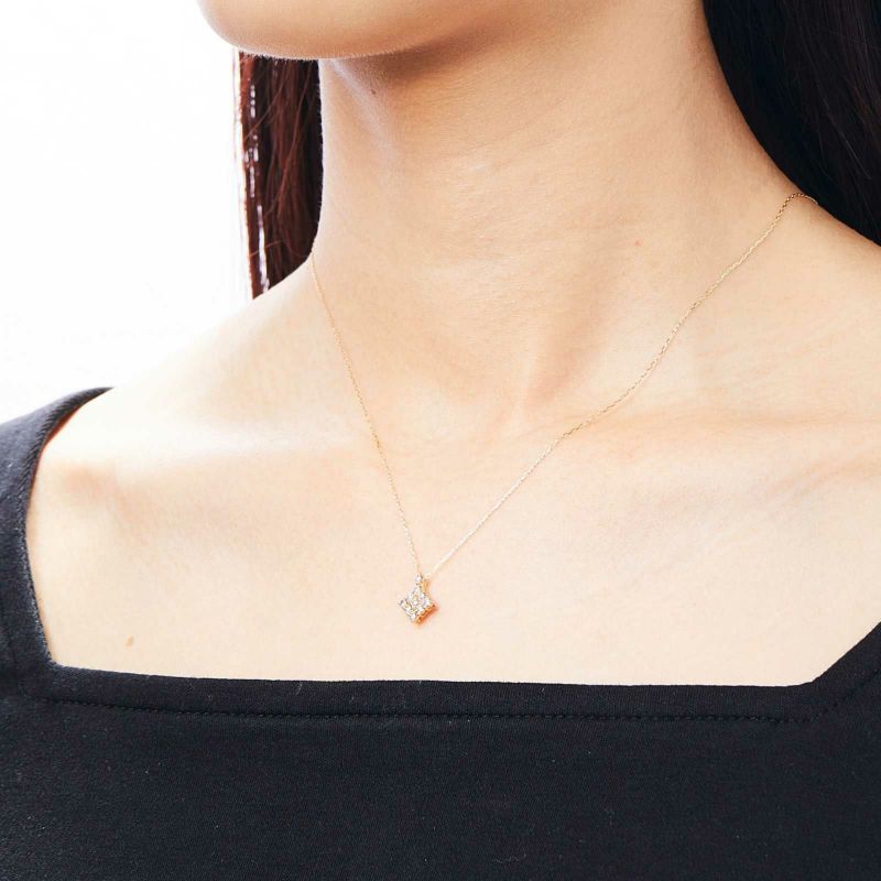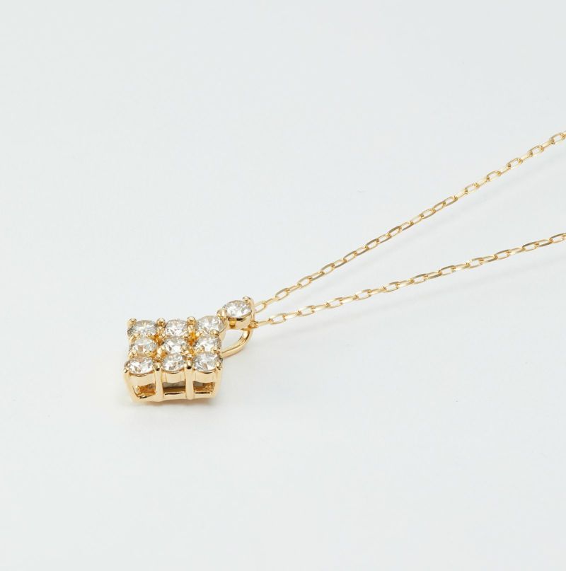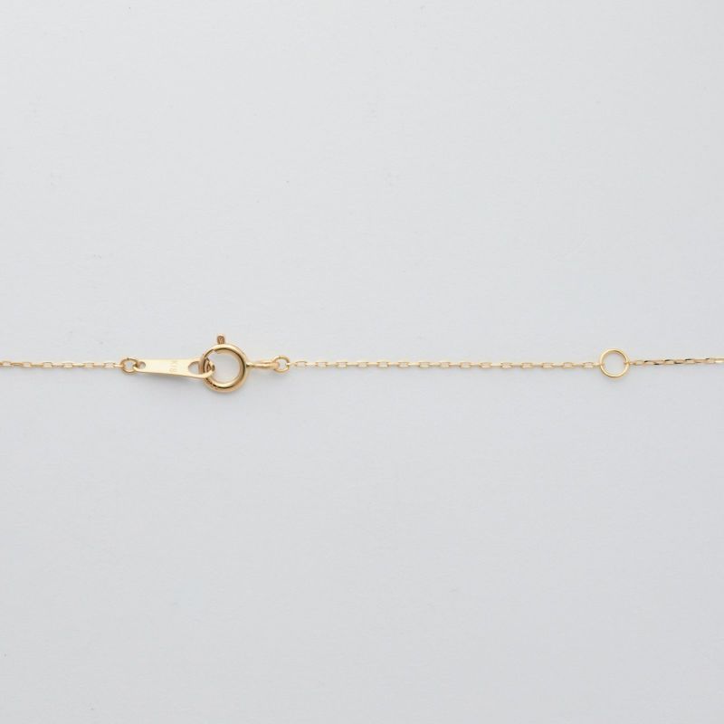 K18 イエローゴールドのダイヤモンドネックレス。留め具部分にもダイヤモンドがついた華やかなデザインのアイテム。合計0.28ctのダイヤモンドが美しく輝く華やかで上品なネックレスです。