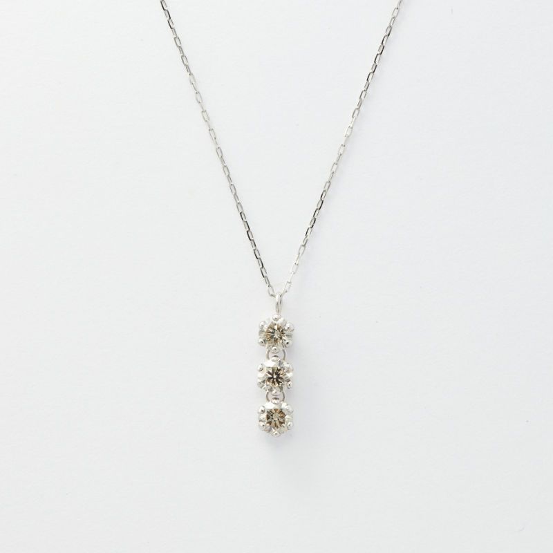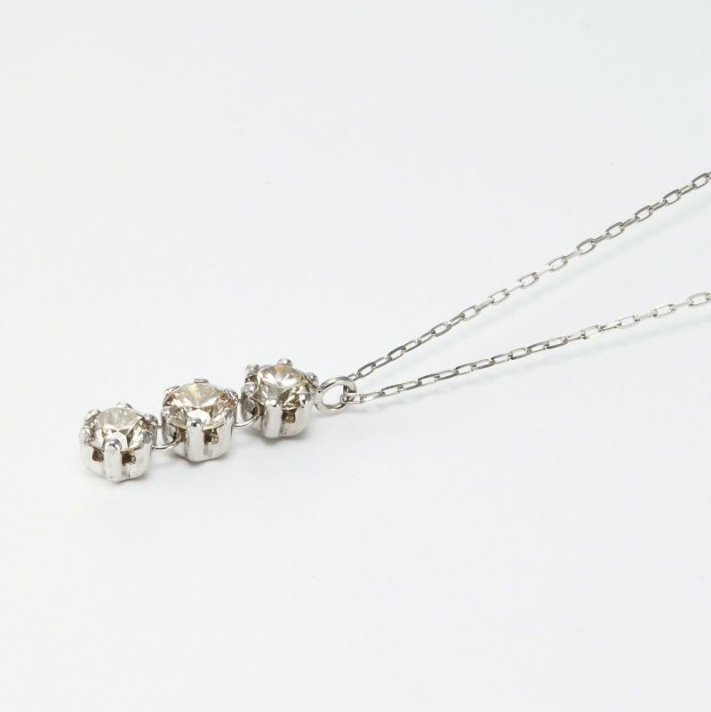 プラチナのスリーストーンダイヤモンドネックレス。合計0.5ctものダイヤモンドが並んだ美しいアイテム。スリーストーンは「過去・現在・未来」を表すと言われており、お守りにも、未来の自分へのエールにも、もちろん大切な人へのプレゼントにも最適です。